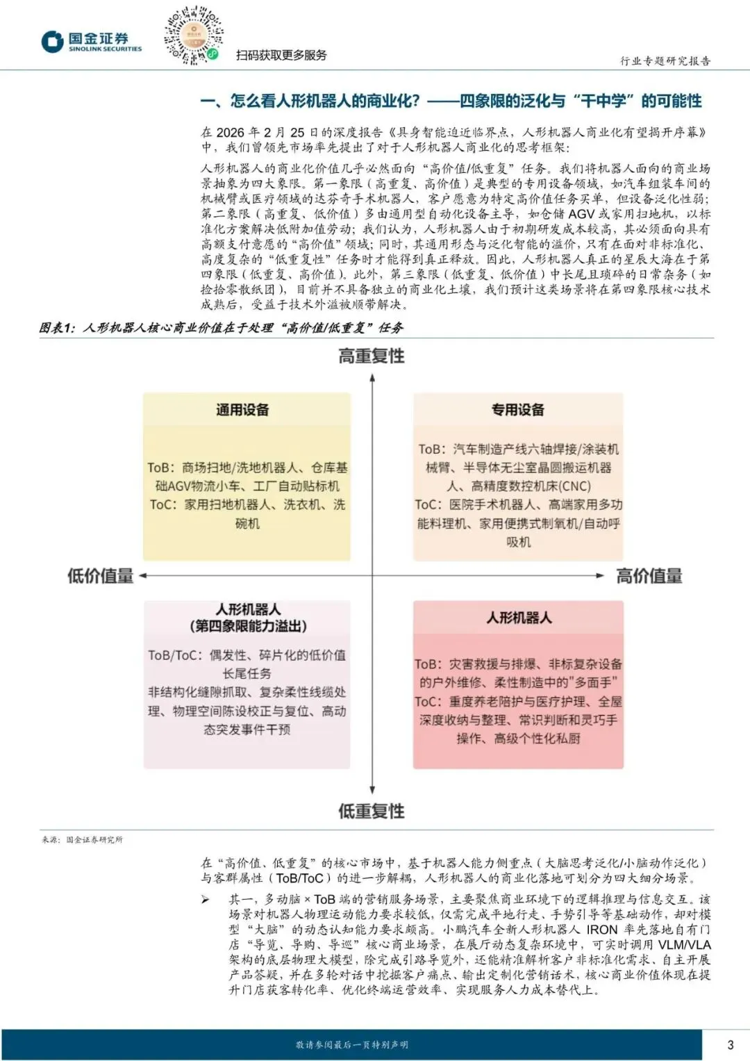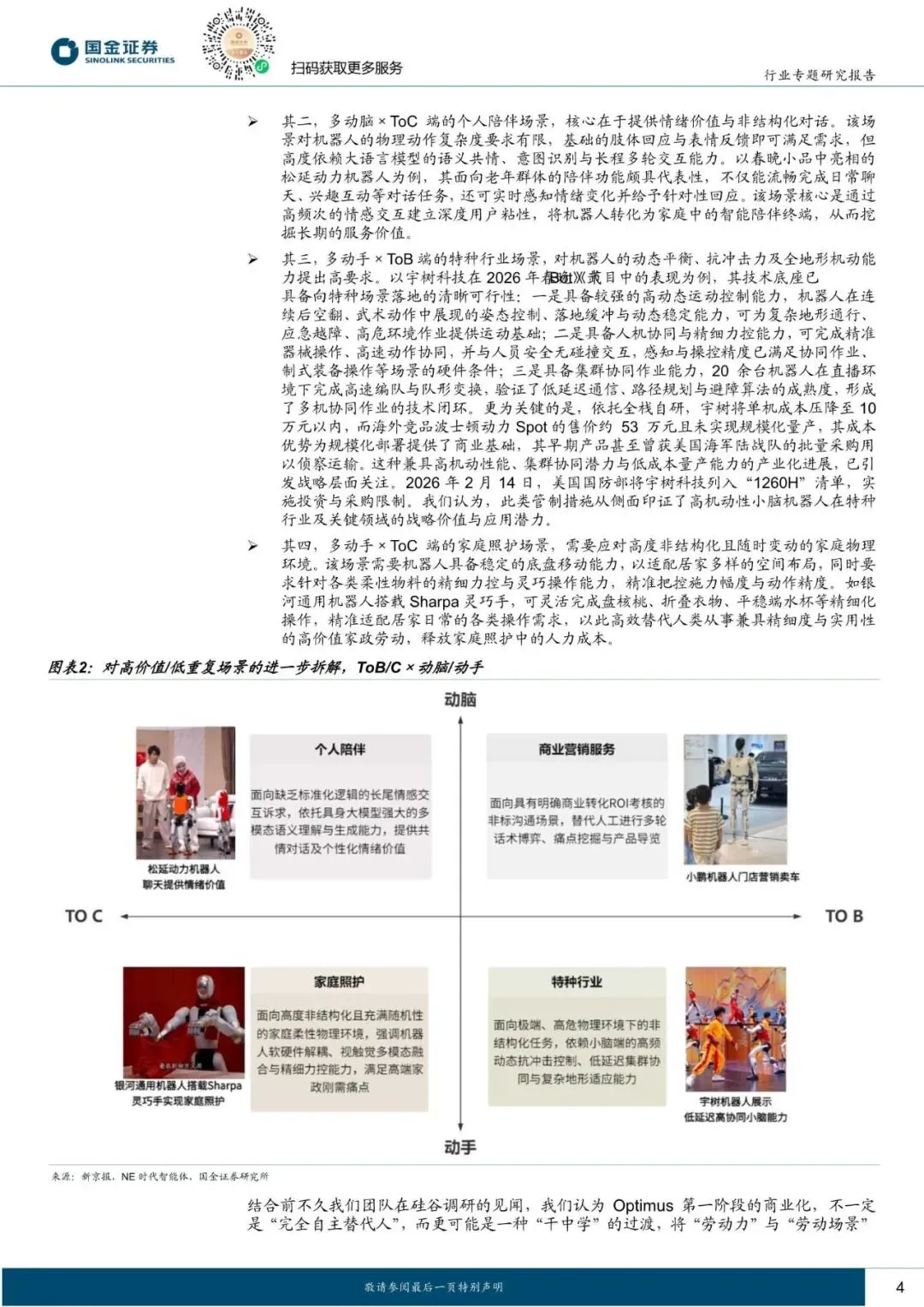 在 2026 年 2 月 25 日的深度报告《具身智能迫近临界点,人形机器人商业化有望揭开序幕》中,我们曾领先市场率先提出了对于人形机器人商业化的思考框架:人形机器人所面向的工作环境必然是“高价值量+低重复性”的场景,上述场景又会在ToB/C 客群差异、大脑/小脑层面泛化性要求的区分下形成四类买单方画像清晰且现阶段具身智能足以胜任的商业化场景——1)ToB+大脑泛化:导览、导购、导巡场景。2)ToB+小脑泛化:特种行业场景。3)ToC+大脑泛化:个人陪伴场景。4)ToC+小脑泛化:家庭照护场景。