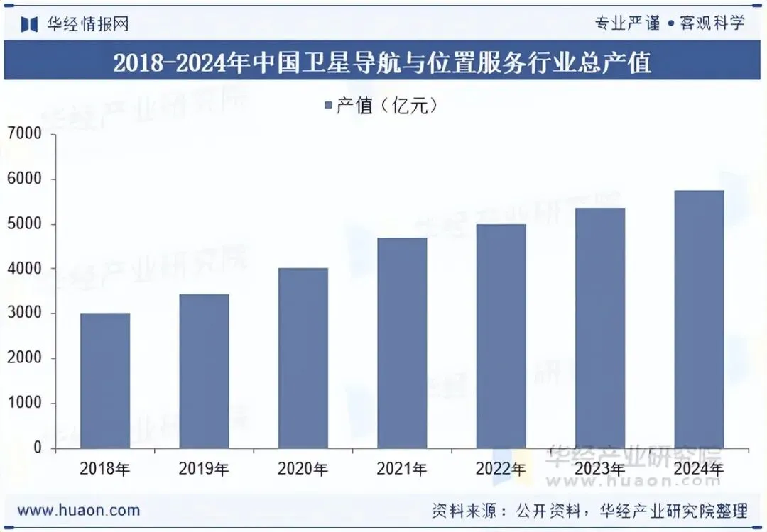 时空信息、定位导航服务已经成为国家重要的新型基础设施,北斗卫星导航系统作为国家“新基建”战略的重要基础支撑,已经在国民经济、国防军事中得到广泛应用,建立了从芯片、板卡、天线到终端、软件和服务的全自主产业链,是我国重要的战略性新兴产业。据统计,2022-2024年我国卫星导航与位置服务产业总体产值分别达到5007亿元、5362亿元与5758亿元,增长率分别为6.76%、7.09%与7.39%。