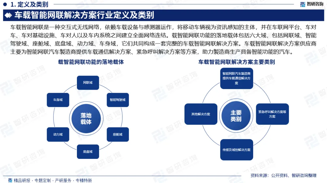 行业基本定义:车载智能网联是一种交互式无线网络,依赖车载设备与感测器运作,将移动车辆视为资讯感知的主体,并在车联网平台、车对车、车对基础设施、车对人以及车内系统之间建立全面网络连结。载智能网联功能的落地载体包括六大域,包括网联域、智能驾驶域、座舱域、底盘域、动力域、车身域,它们共同构成一套完整的车载智能网联解决方案。
