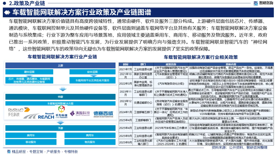 产业链核心节点:车载智能网联解决方案产业链上游硬件层面包括芯片、传感器、通讯模块、车载联网控制单元及其他硬件设备等,软件层面则涵盖车载网络平台及其他有关服务,上游行业属于技术密集型,进入壁垒较高;车载智能网联解决方案设备制造与系统集成;行业下游为整车应用与场景落地,应用领域主要涵盖乘用车、商用车、移动服务及物流服务。