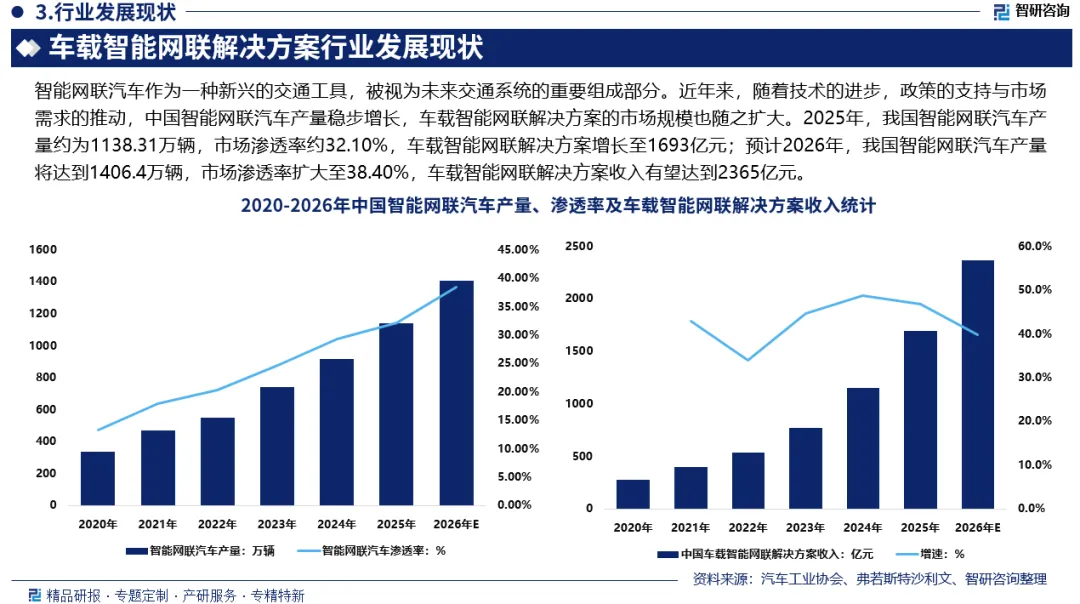 市场规模:随着智能网联汽车产量持续增长,中国车载智能网联解决方案的市场规模也随之扩大。2025年,我国车载智能网联解决方案收入从2020年的280亿元增长至1693亿元,预计2026年有望达到2365亿元。