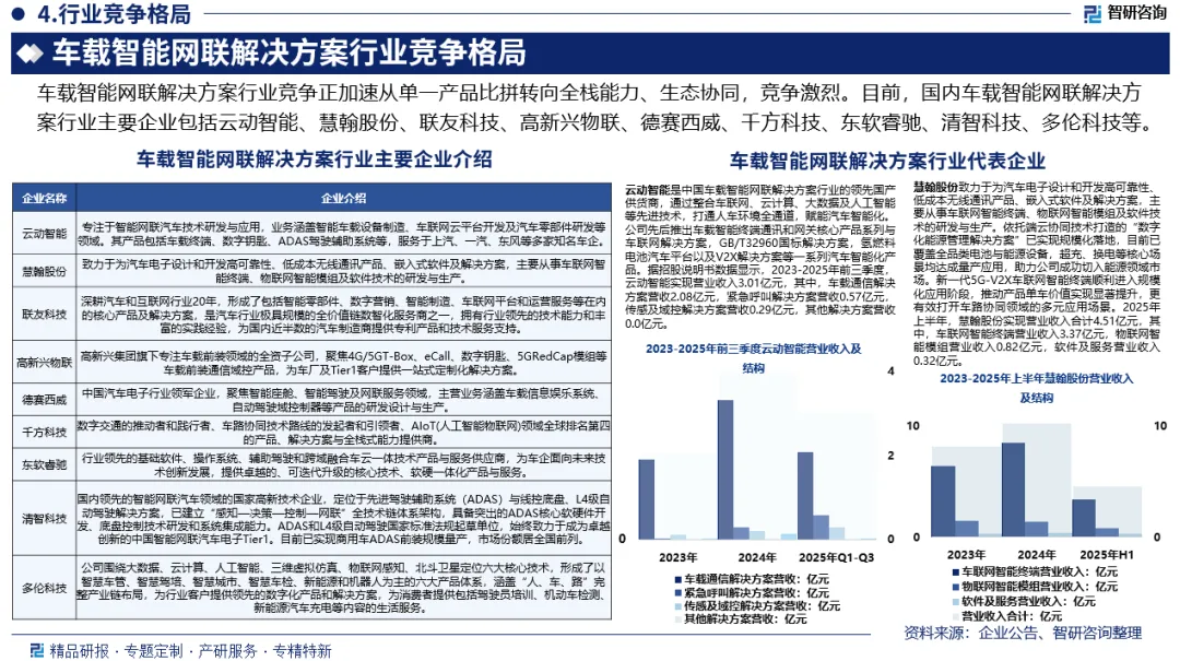 竞争情况:车载智能网联解决方案行业竞争正加速从单一产品比拼转向全栈能力、生态协同,竞争激烈。目前,国内车载智能网联解决方案行业主要企业包括云动智能、慧翰股份、联友科技、高新兴物联、德赛西威、千方科技、东软睿驰、清智科技、多伦科技等。