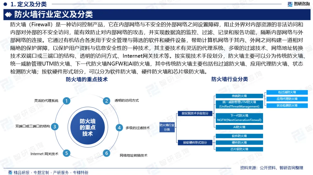 行业定义及分类:防火墙是一种访问控制产品,它在内部网络与不安全的外部网络之间设置障碍,阻止外界对内部资源的非法访问和内部对外部的不安全访问,能有效防止对内部网络的攻击。按实现技术手段防火墙可以分为传统防火墙、统一威胁管理UTM防火墙、下一代防火墙NGFW和AI防火墙;按软硬件形式可以分为软件防火墙、硬件防火墙和芯片级防火墙。