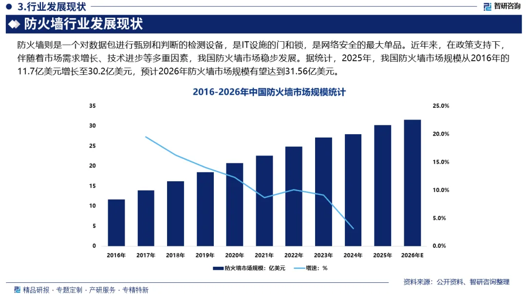 市场规模:防火墙是一个对数据包进行甄别和判断的检测设备,是IT设施的门和锁,是网络安全的最大单品。近年来,在政策支持下,伴随着市场需求增长、技术进步等多重因素,我国防火墙市场稳步发展。2025年,我国防火墙市场规模从2016年的11.7亿美元增长至30.2亿美元,预计2026年防火墙市场规模有望达到31.56亿美元。