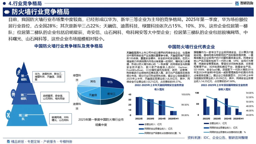 竞争情况:目前,我国防火墙行业市场集中度较高,已经形成以华为、新华三等企业为主导的竞争格局。2025年第一季度,华为场份额位居行业首位,占全国28%;其次是新华三占22%;天融信、迪普科技、绿盟科技依次占15%、10%、3%,这些企业位居第一梯队;位居第二梯队的企业包括启明星辰、奇安信、山石网科、电科网安等大中型企业;位居第三梯队的企业包括锐境网络、中科曙光、山石网科等。