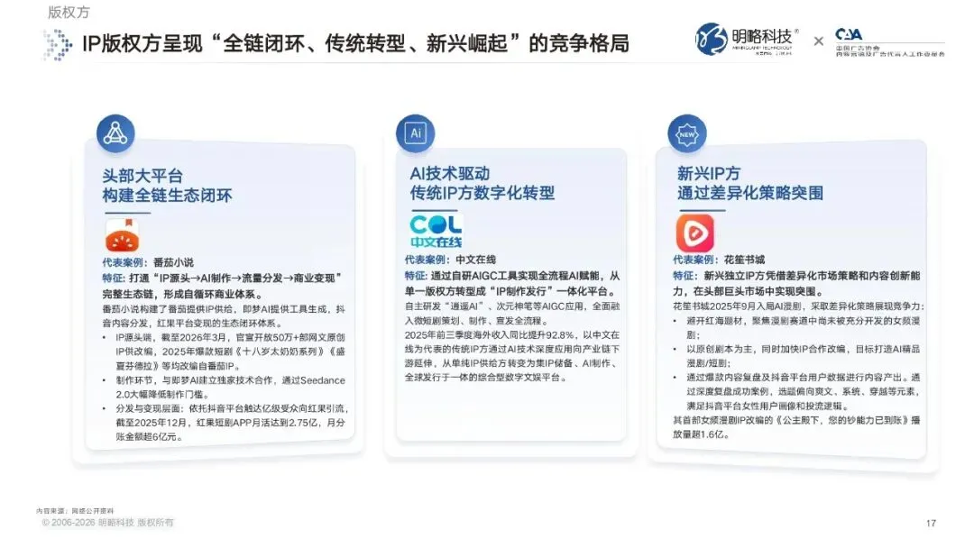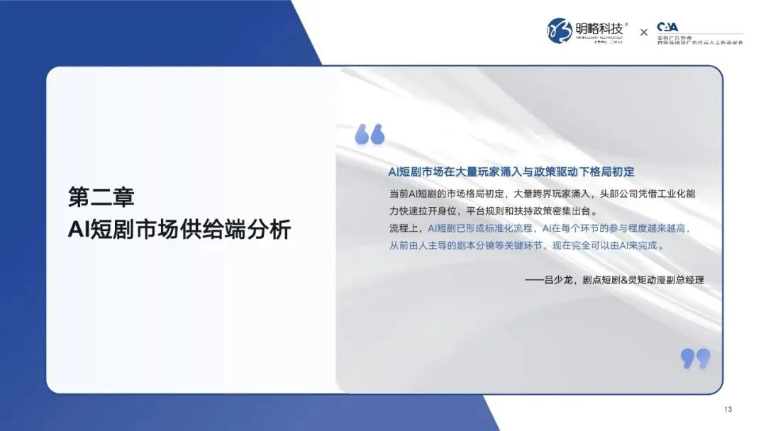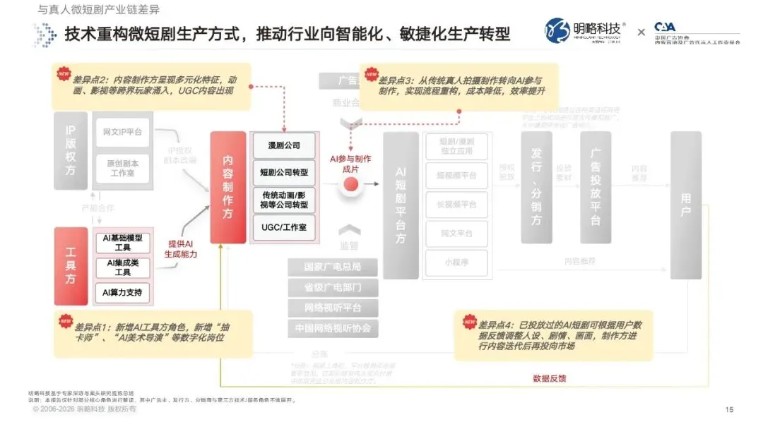 商业模式上,主要为付费观看,单集付费 0.5-2元;广告植入,AI生成场景中自然植入品牌,单剧广告收入达百万级;IP 衍生,角色周边、游戏改编、真人剧翻拍,拓展长尾价值;出海变现,东南亚、中东市场需求旺盛,单剧出海收益达国内3-5倍。