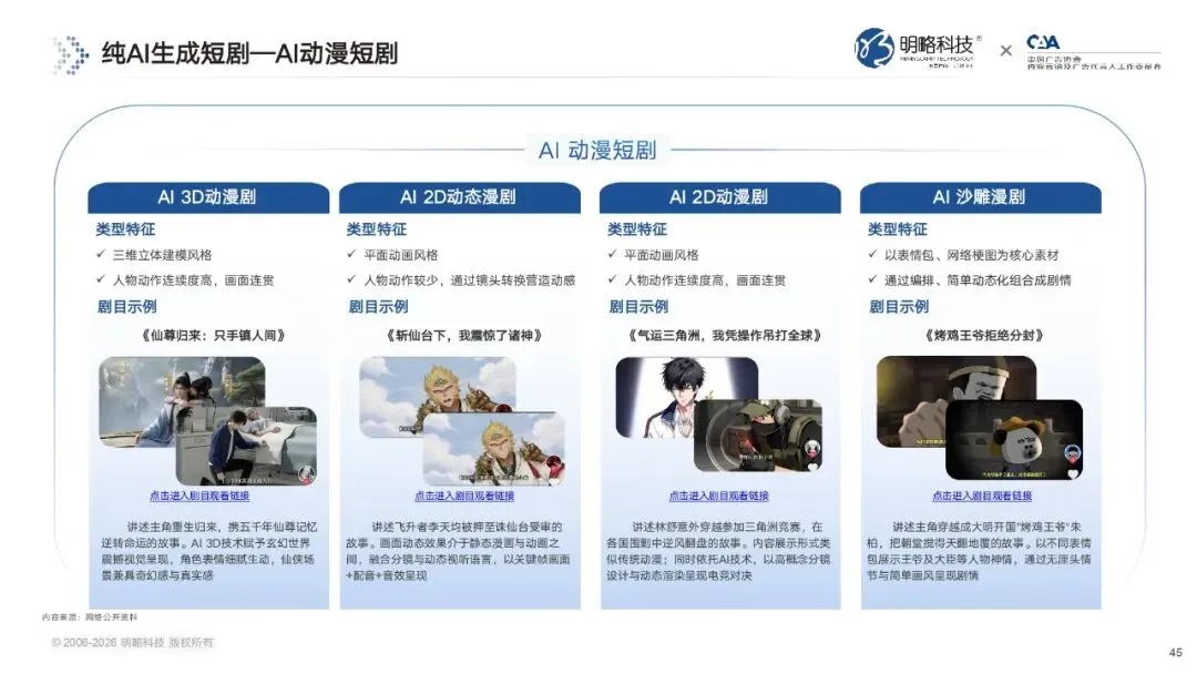随着AI技术的不断成熟,其应用也得到不断改善。其中AI短剧行业正经历从技术验证到规模化爆发的关键阶段,成本革命与效率提升是核心驱动力。短剧的成熟化发展,面临着 "产能过剩、精品稀缺" 的结构性矛盾,创意、技术、合规将成为企业生存的三大支柱。而AI短剧将与真人短剧形成差异化竞争格局,共同推动短剧行业向精品化、多元化、全球化方向发展,为用户提供更丰富的娱乐体验。究竟能走多远,有待市场的进一步验证。2026年AI短剧市场规模预计突破240亿元,用户规模达2.8亿,较2025年增长133%。AI技术将制作成本从传统真人短剧的 5-10万元/集降至数千元/集,周期从数月缩至数天,引发行业供给侧革命。AI制作的短剧,从内容上主要为AI 仿真人短剧,此种短剧类型最受欢迎,占比 38%,主打都市、仙侠、悬疑等题材;其次是AI 动漫短剧,成本最低,适合玄幻、奇幻题材,单集成本仅数千元。