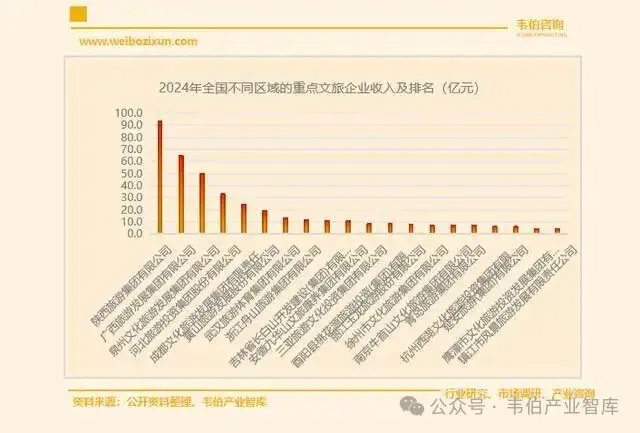 20家区域文旅企业中,有一半数量收入超过10亿元,陕西旅游集团以93亿元的营收位列第一,广西旅游发展集团、泉州文化旅游发展集团分别以64.6、49.9亿元位列第二、三位。