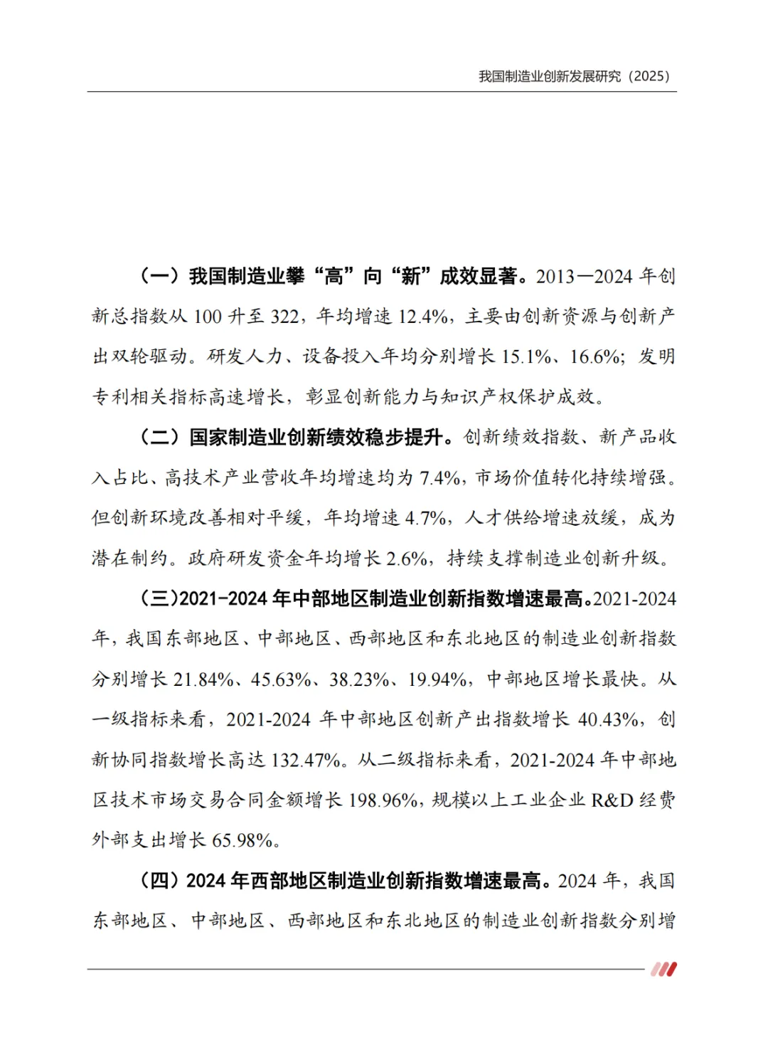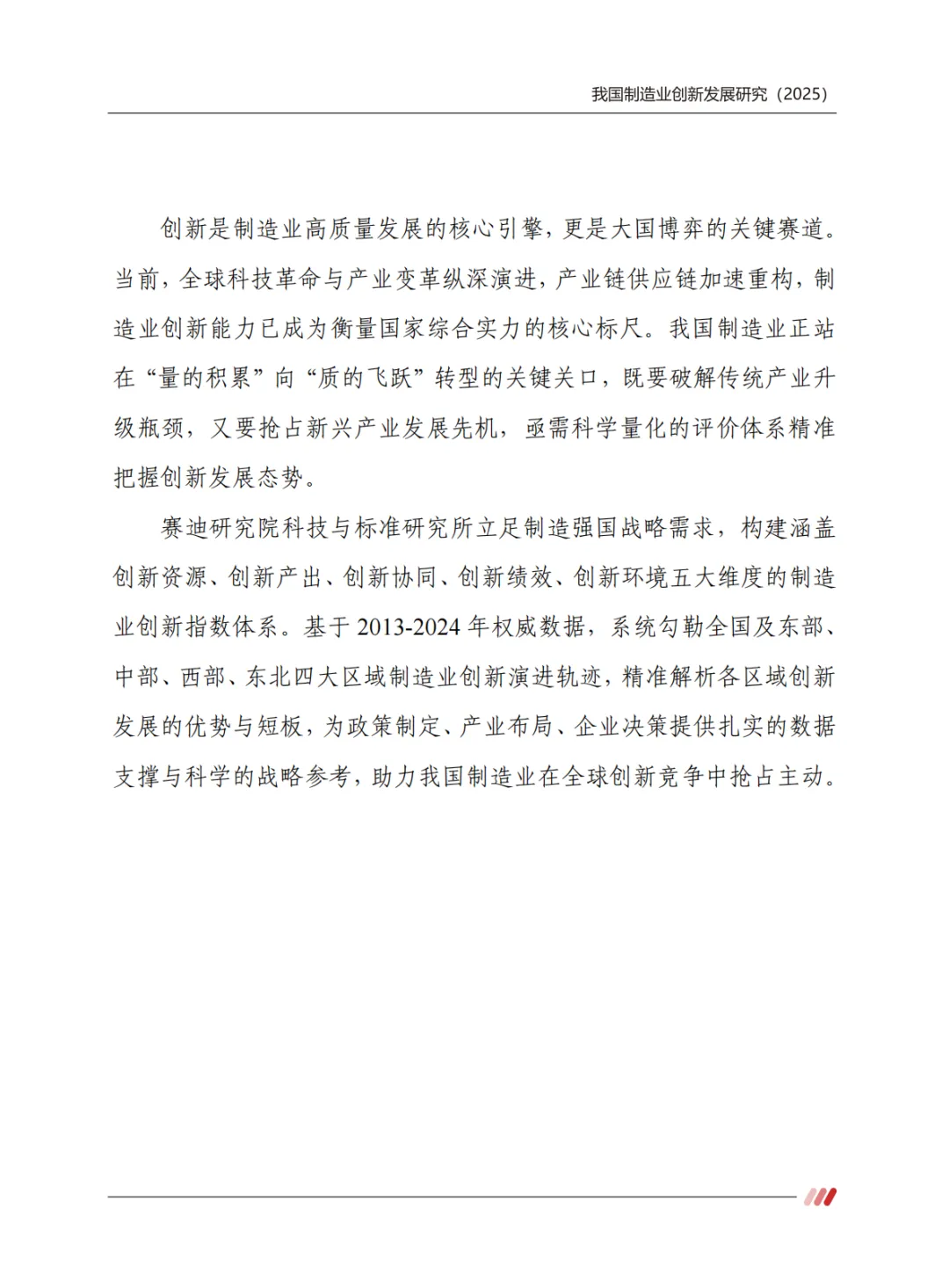 《2025年我国制造业创新发展研究报告》由赛迪研究院发布的报告内容详实、数据丰富,系统梳理了2013-2024年我国制造业创新发展的整体态势与区域格局。