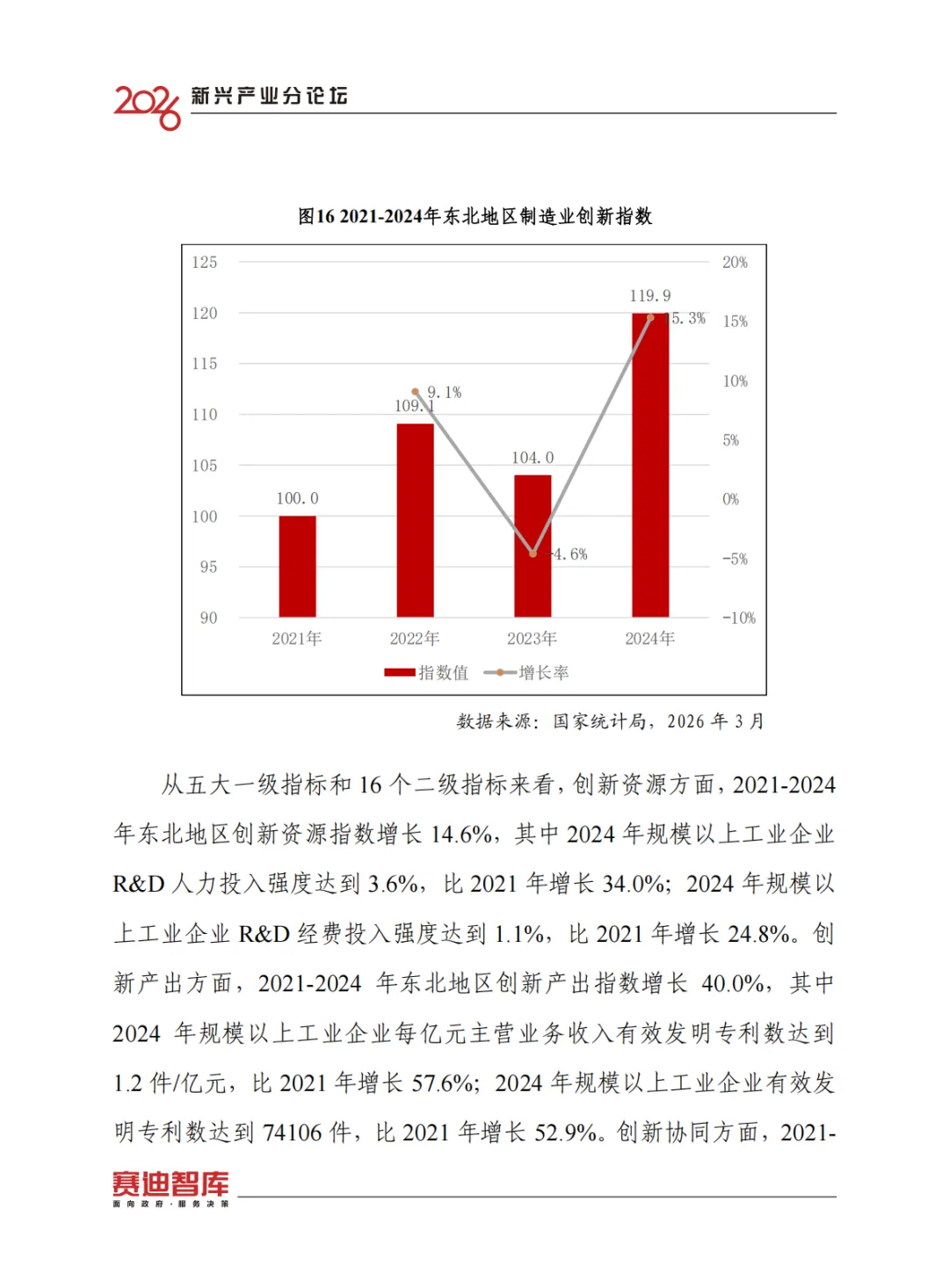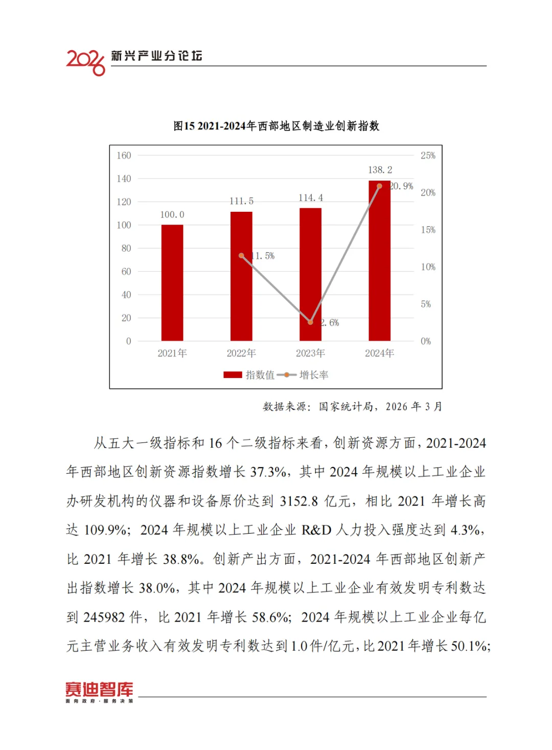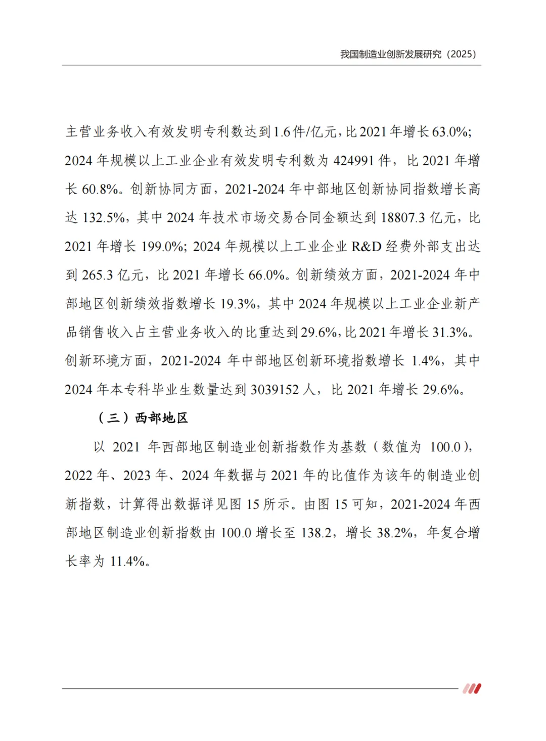 2024年单年增速:西部地区(+20.87%)跃居第一,超过中部(+11.26%)、东北(+15.30%)和东部(+6.60%)。西部地区在创新资源(+22.81%)、创新产出(+24.82%)和创新协同(+36.10%)上全面提速,尤其是研发设备原价增长77.43%、外部研发支出增长50.81%。