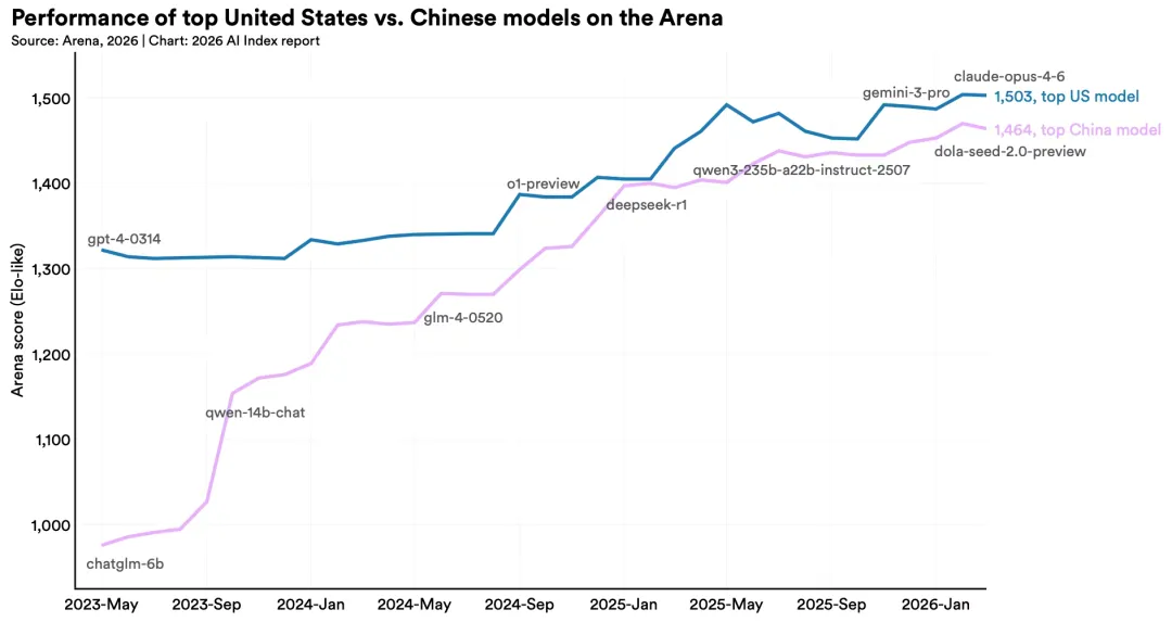 这场博弈的转折点发生在2025年2月,当时DeepSeek发布的R1模型曾短暂追平美国模型,随后双方进入了高频的性能更迭期。今年报告的主编内斯特·佩罗(Nestor Maslej)指出,这种领先优势的反复变化,标志着全球顶级AI研发已经进入了某种程度的“技术平权”。
