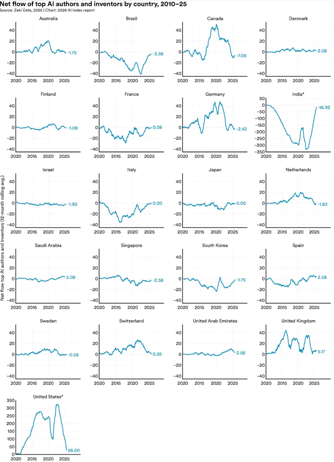 到目前为止,美国拥有的AI研究人员和开发者数量远超任何其他国家,但这些专家流入美国的速度正在急剧放缓。自2017年以来,移居美国的AI学者数量下降了89%。这种下降正在加速,仅在过去一年中就下降了80%。