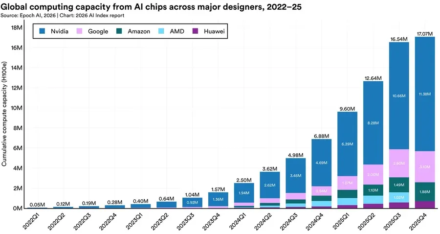 从计算能力来看,根据Epoch AI以英伟达H100e计算能力为标尺的统计,英伟达GPU占全球人工智能总计算能力的60%以上,谷歌与亚马逊分列第二、第三位。全球人工智能计算能力自2022年以来每年增长3.3倍,自2021年(追踪的第一年)以来总计算能力增长了30倍。