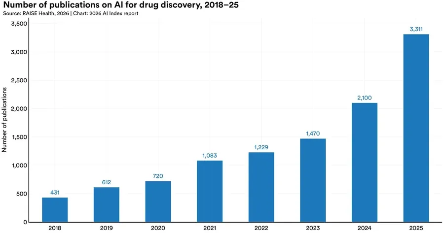 2018年至2025年,关于AI用于药物发现的出版物数量持续增加,近两年增速加快