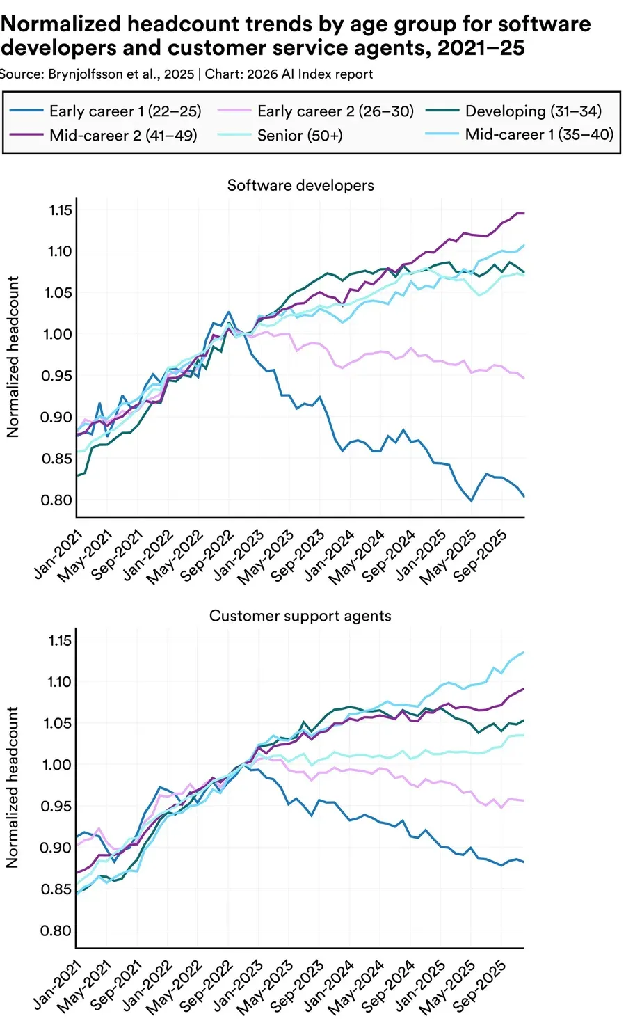 劳动力数据显示明确的代际差异。到2025年9月,美国22至25岁软件开发者的就业人数较2022年峰值下降近20%,而年长开发者数量持续增长。客户支持智能体领域呈现类似趋势。