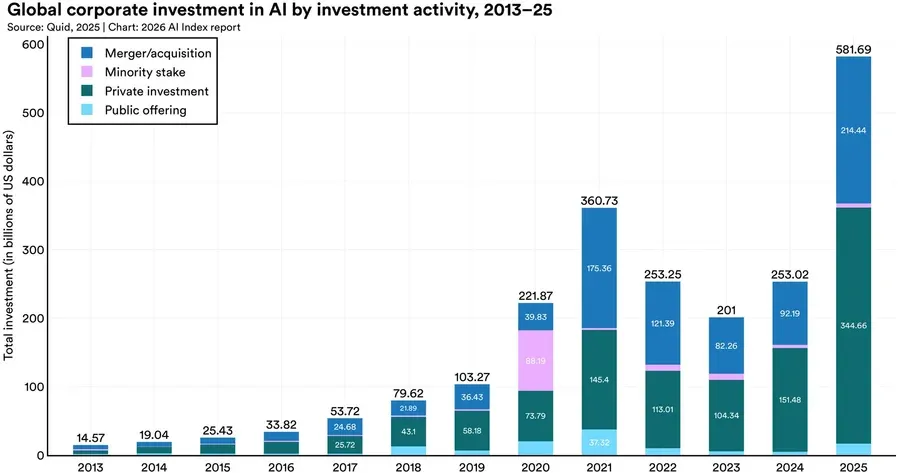 Quid数据显示,2013年至2025年全球企业AI投资按活动类型划分。2021年投资上升,2022至2024年下降,2025年再次大幅增长