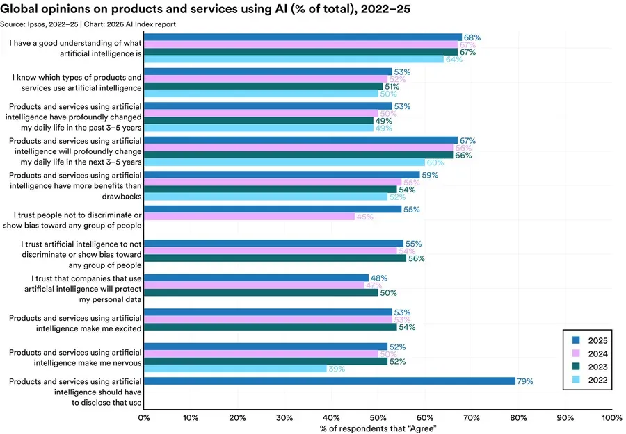 根据益普索(Ipsos)调查数据,认为AI“利大于弊”的受访者比例从2024年的55%升至59%。表示对AI有“很好理解”的受访者比例从67%略升至68%。同时,52%的受访者表示使用AI的产品和服务让他们感到“紧张”。