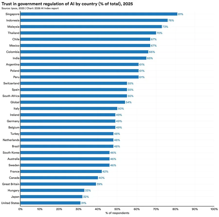 各国对政府AI监管信任度调查显示,新加坡以81%居首,美国以31%垫底