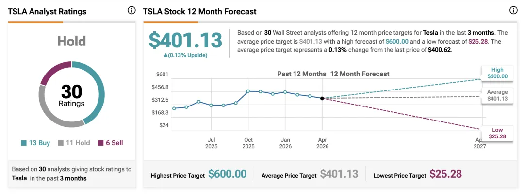 然而分析师内部分歧显著。TipRanks汇总的30位分析师中,13位给出买入评级,11位持有,6位卖出,整体评级为持有,看空比例明显高于一般大型科技股的分析师覆盖比例。