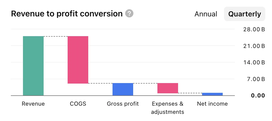 特斯拉季度营收利润转化瀑布图。营收约270亿美元,销售成本(COGS)约240亿美元,毛利润约60亿美元,运营费用及调整项约30亿美元,最终净利润约15亿美元。营收到净利润的转化率约为5.6%数据来源:特斯拉财报