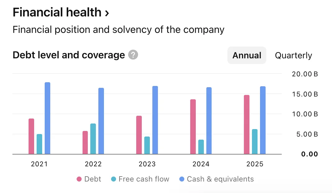 尽管如此特斯拉的资产负债表依然强健:截至2025年底账上现金、现金等价物和短期投资合计440.6亿美元,债务约83.8亿美元,净现金头寸超过350亿美元。这为大规模AI和机器人投入提供了充足的弹药。