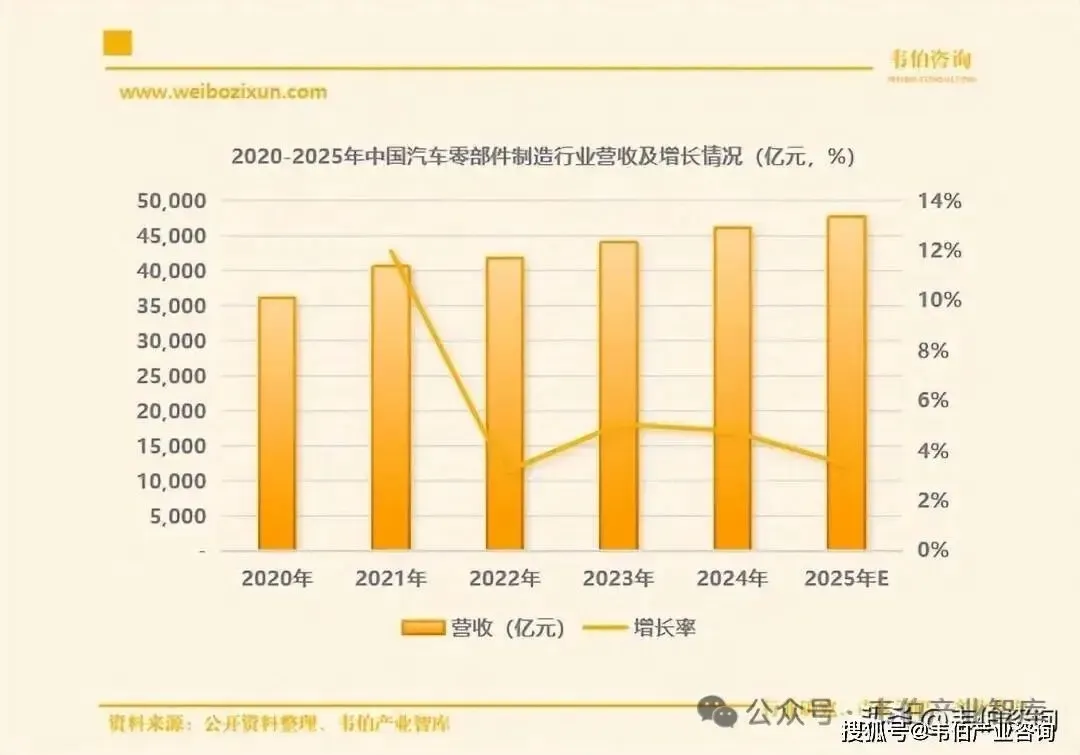 图表1:2020-2025年中国汽车零部件制造业营收及增长情况(亿元,%)