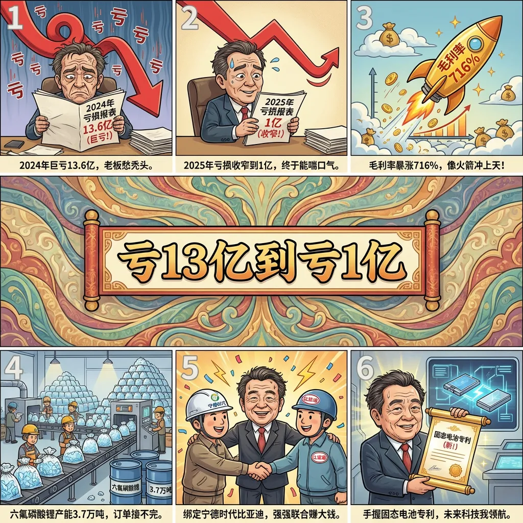 解读: 亏13亿到亏1亿:2024年亏13.6亿,2025年亏1亿,毛利率暴涨716%,六氟磷酸锂产能3.7万吨,绑定宁德时代比亚迪,固态电池专利在手。