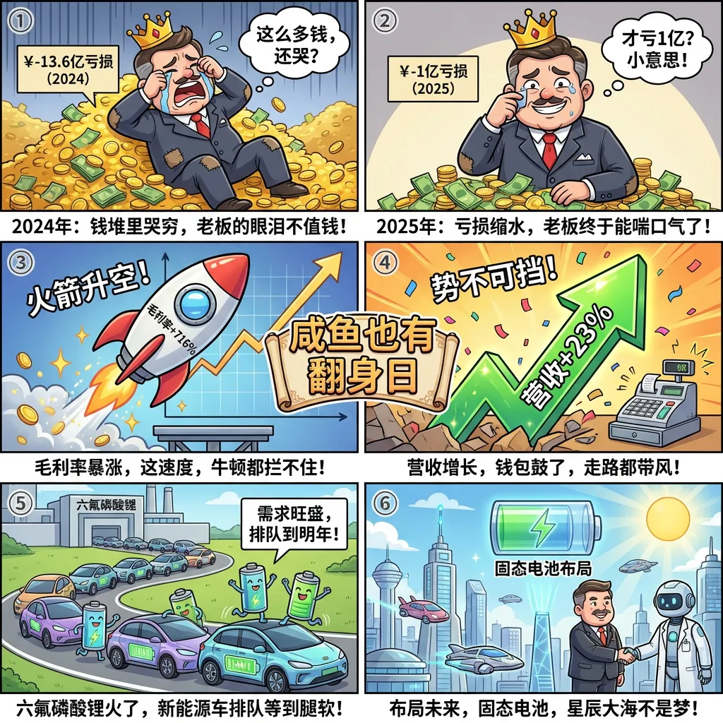 解读: 咸鱼也有翻身日:2024年亏13.6亿,2025年亏1亿,毛利率暴涨716%,营收增长23%,六氟磷酸锂需求旺盛,固态电池布局未来。