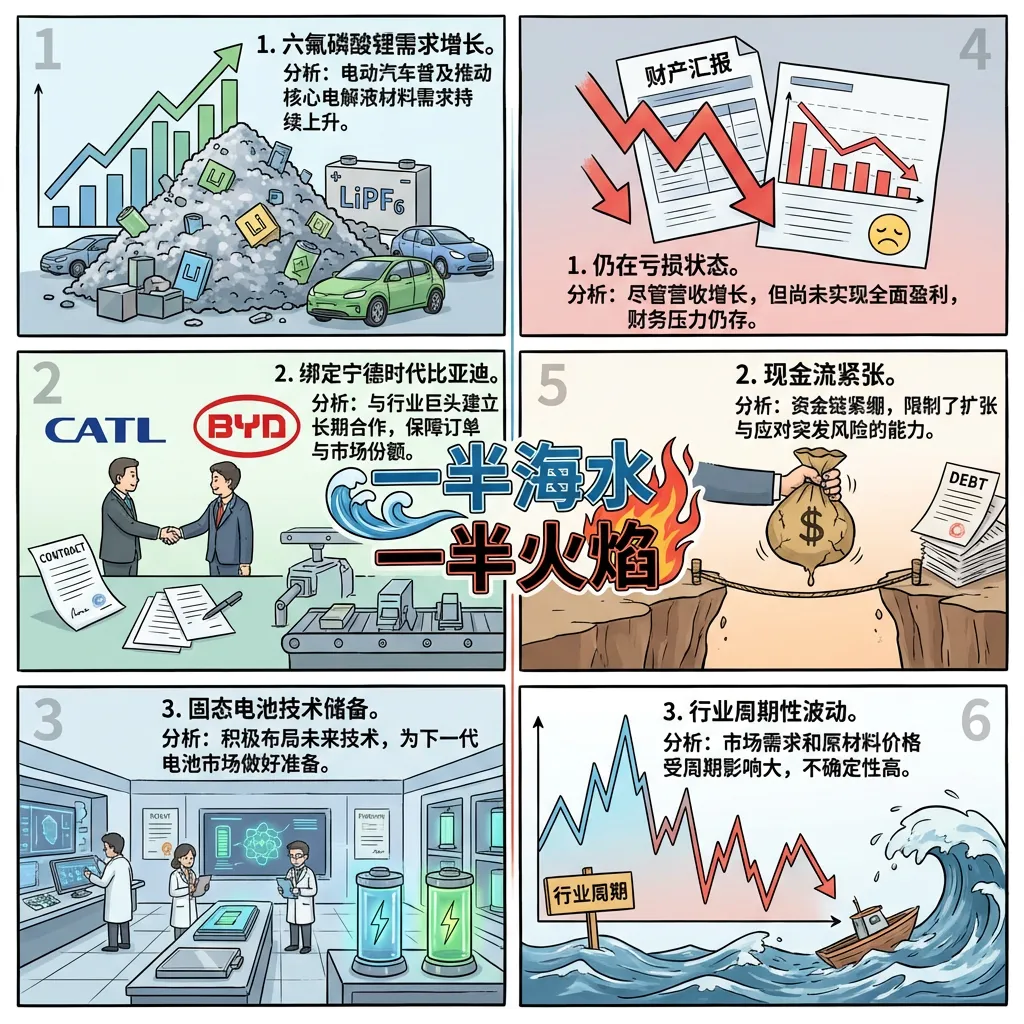公司干啥的:做六氟磷酸锂(新能源车电池材料)和固态电池。技术还行:有固态电池专利,六氟磷酸锂产能3.7万吨。客户稳定:宁德时代、比亚迪等巨头。问题在哪:还在亏钱(虽然亏得少了);钱袋子紧(现金流紧张);行业波动大(价格起伏)。