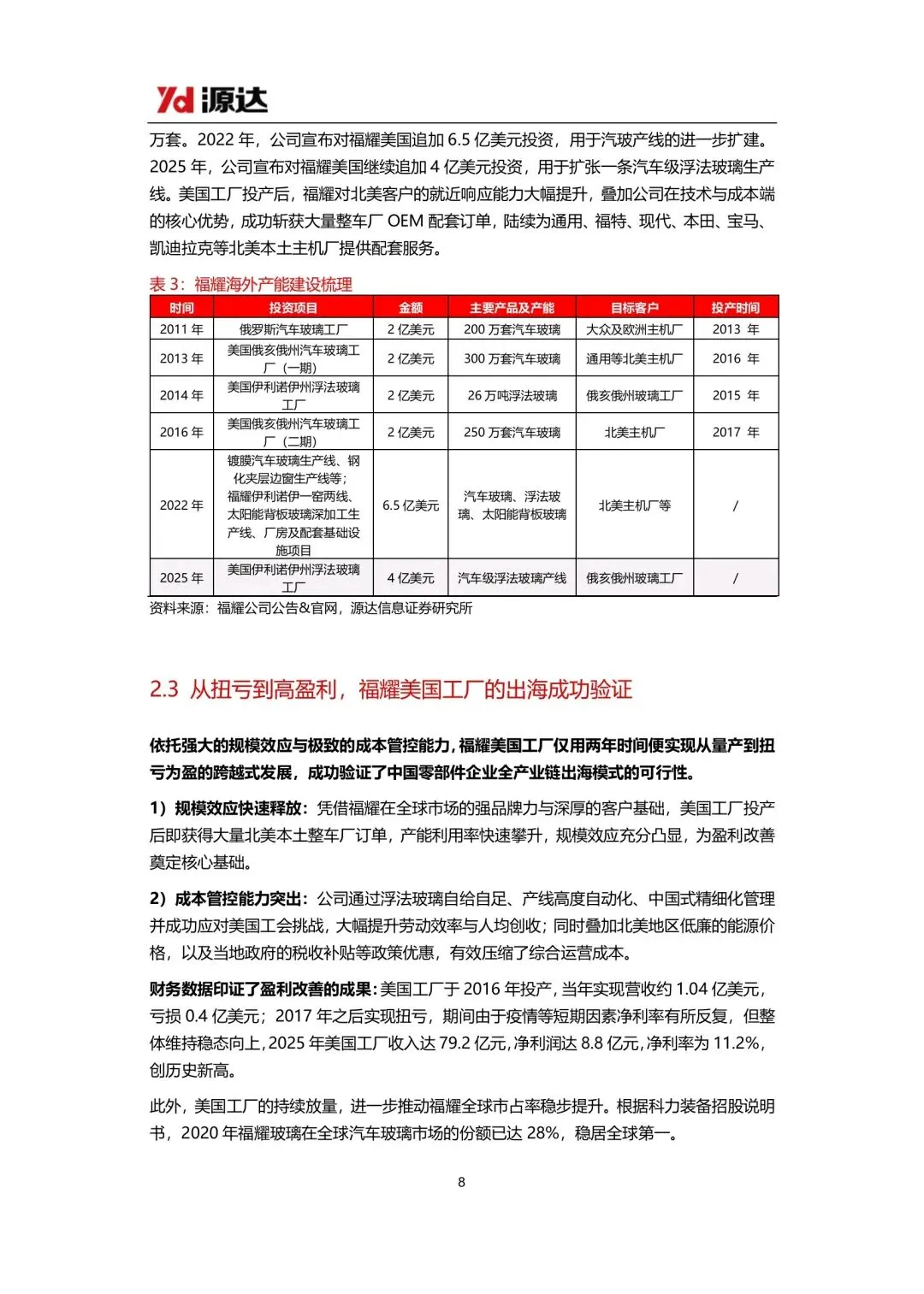 福耀玻璃的路径很清晰——2013年国内市占率63%见顶,成本比全球均价低近一半,毛利率稳在40%,加上通用要求属地化配套,逼出了美国建厂。2016年投产当年亏,2017年扭亏,2025年净利率干到11.2%。关键是全产业链复制过去:汽玻+浮法玻璃自己供,规模效应+极致成本管控,工会那关也过了。