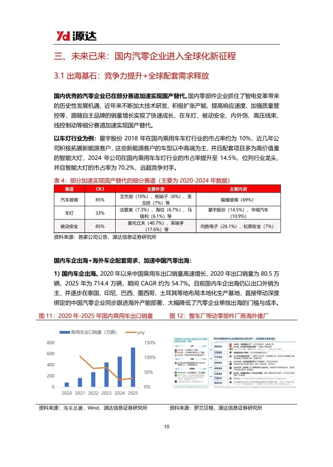 现在轮到第二批企业。车灯、被动安全、线控制动这些赛道国产替代在加速,星宇车灯市占率从10%拉到14.5%。国内车企出海(2025年出口714万辆)带着供应链一起走,特斯拉、Stellantis也在给中国Tier1开全球定点。