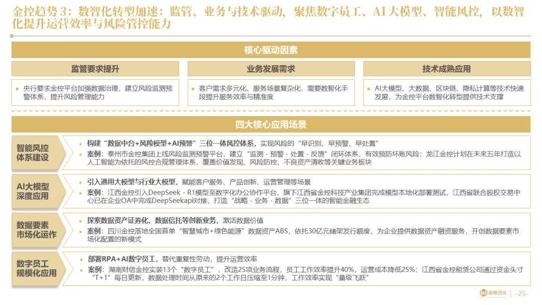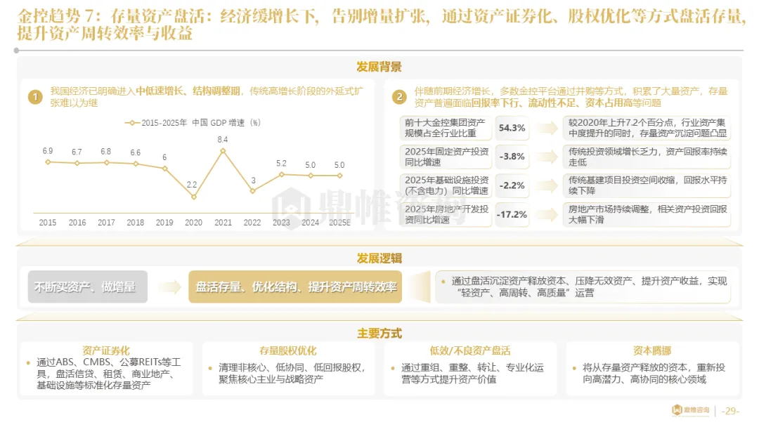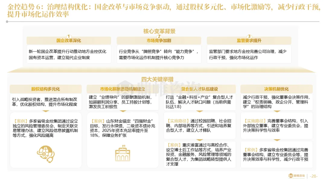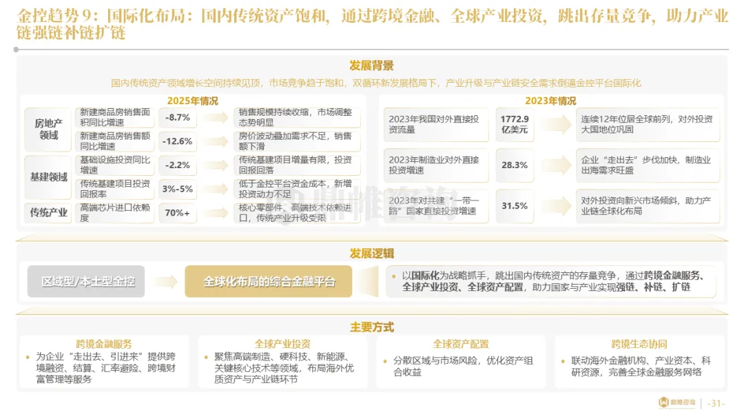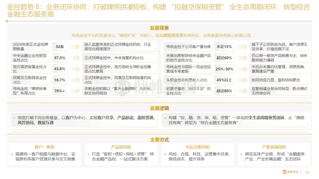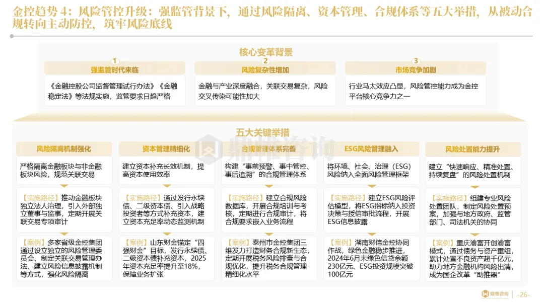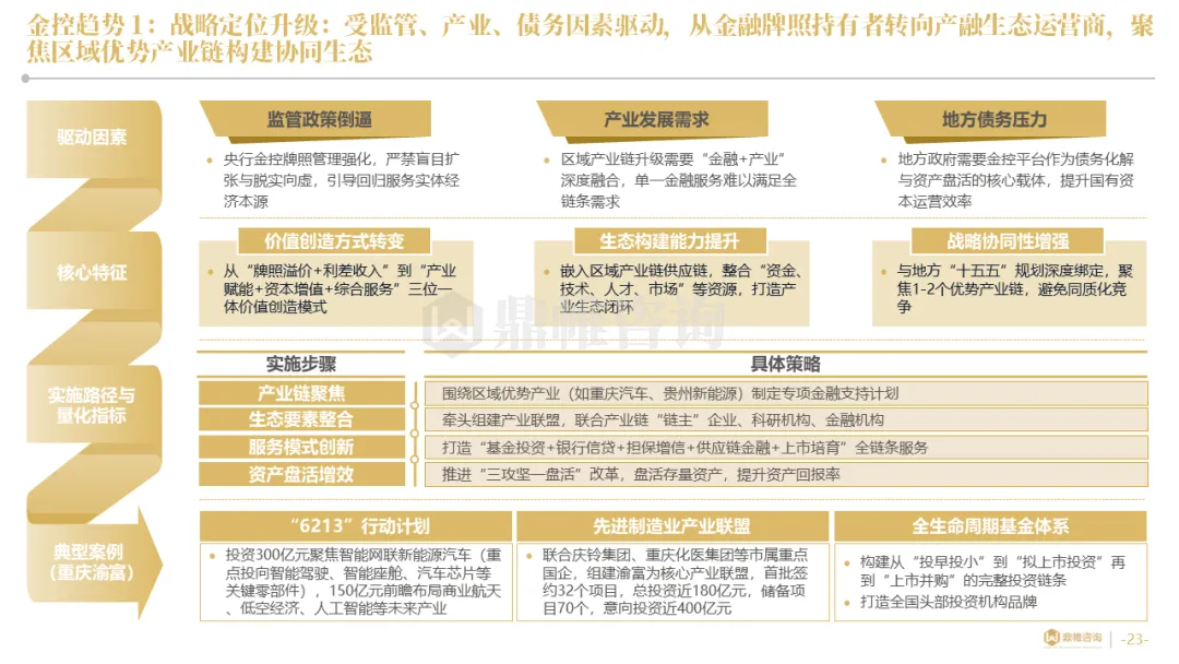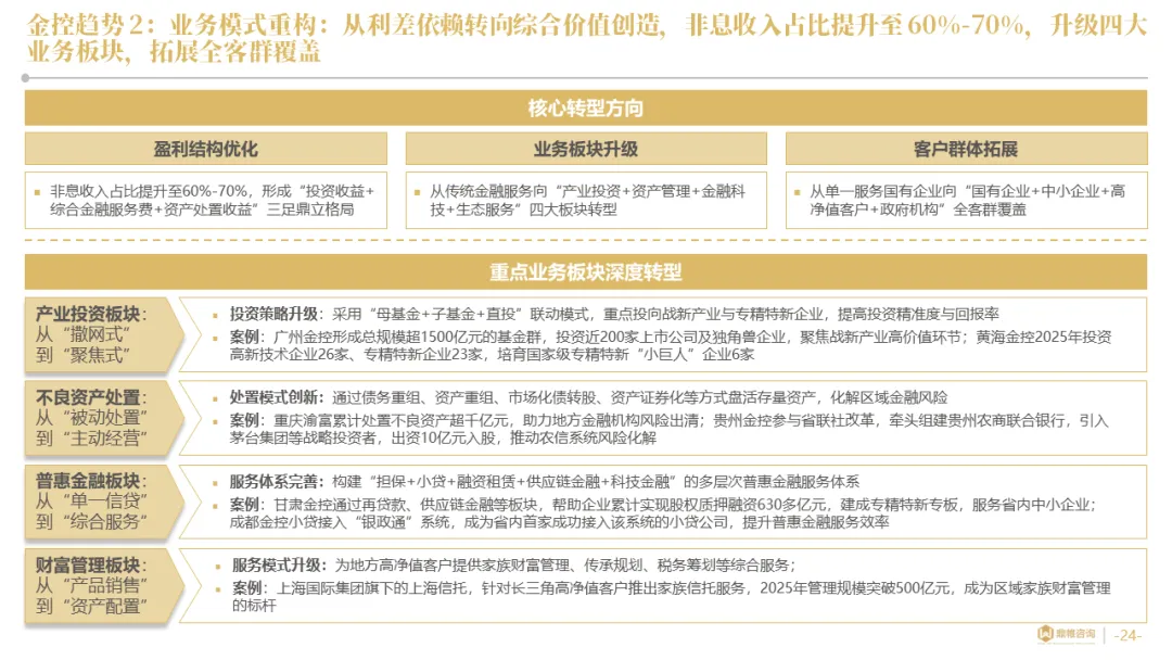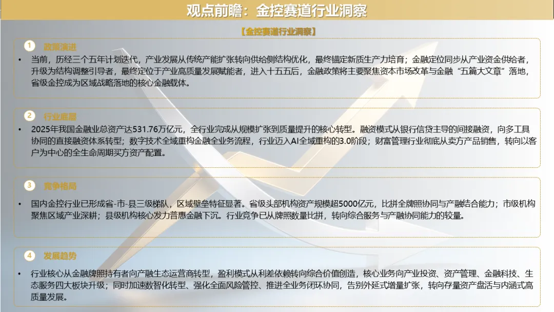 行业核心从金融牌照持有者向产融生态运营商转型,盈利模式从利差依赖转向综合价值创造,核心业务向产业投资、资产管理、金融科技、生态服务四大板块升级;同时加速数智化转型、强化全面风险管控、推进全业务闭环协同,告别外延式增量扩张,转向存量资产盘活与内涵式高质量发展。