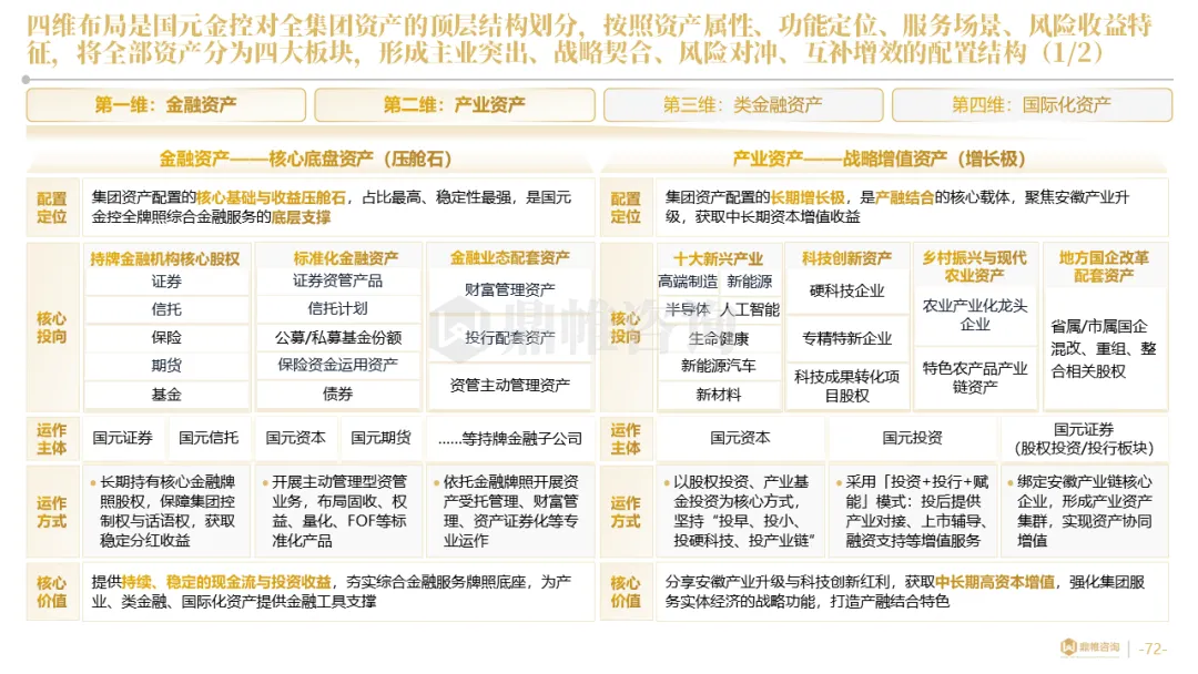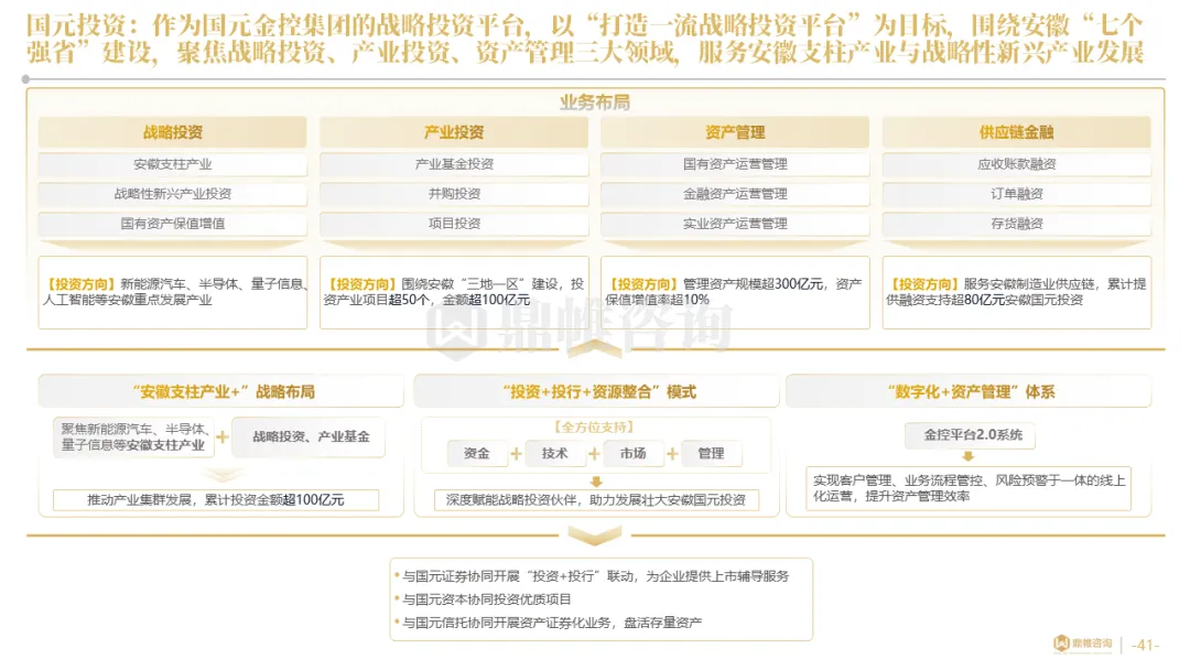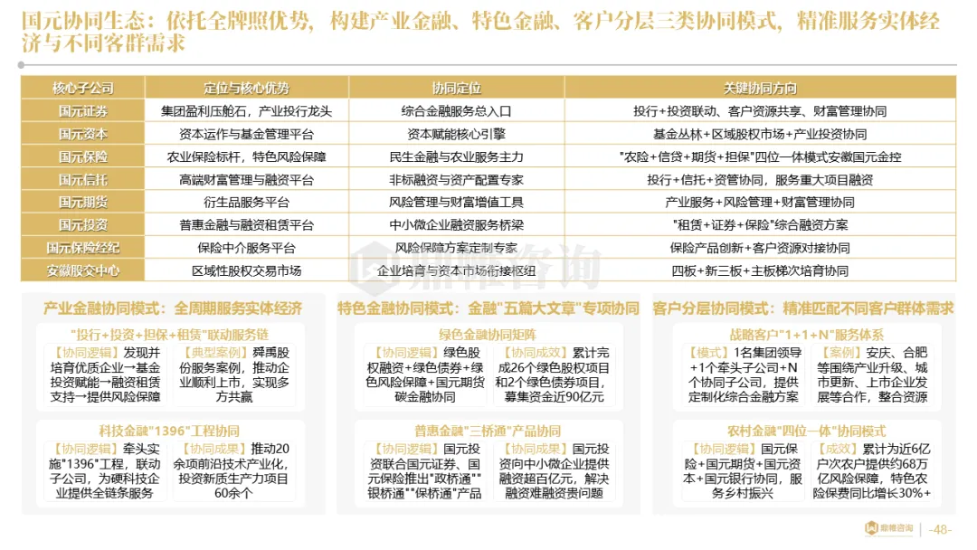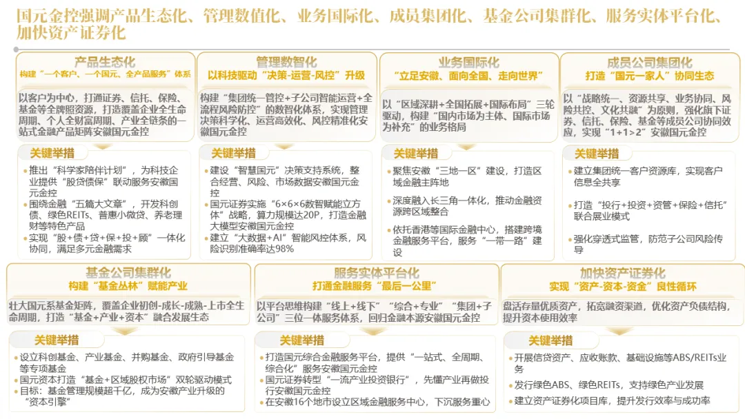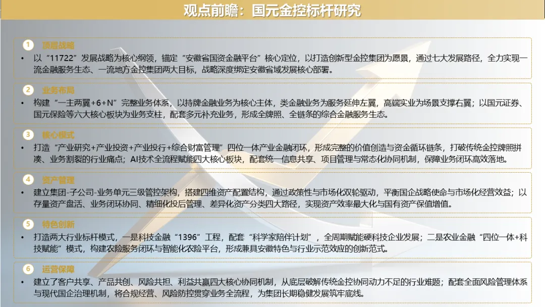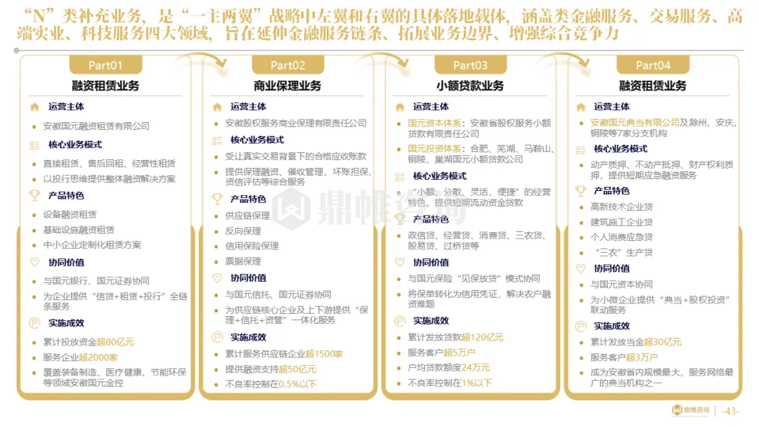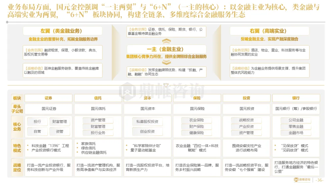 构建“一主两翼+6+N”完整业务体系,以持牌金融业务为核心主体,类金融业务为服务延伸左翼,高端实业为场景支撑右翼;以国元证券、国元保险等六大核心板块为业务支柱,配套多元补充业务,形成全牌照、全链条的综合金融服务生态。