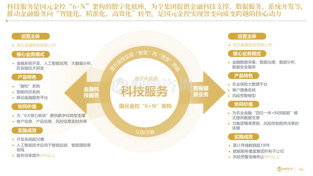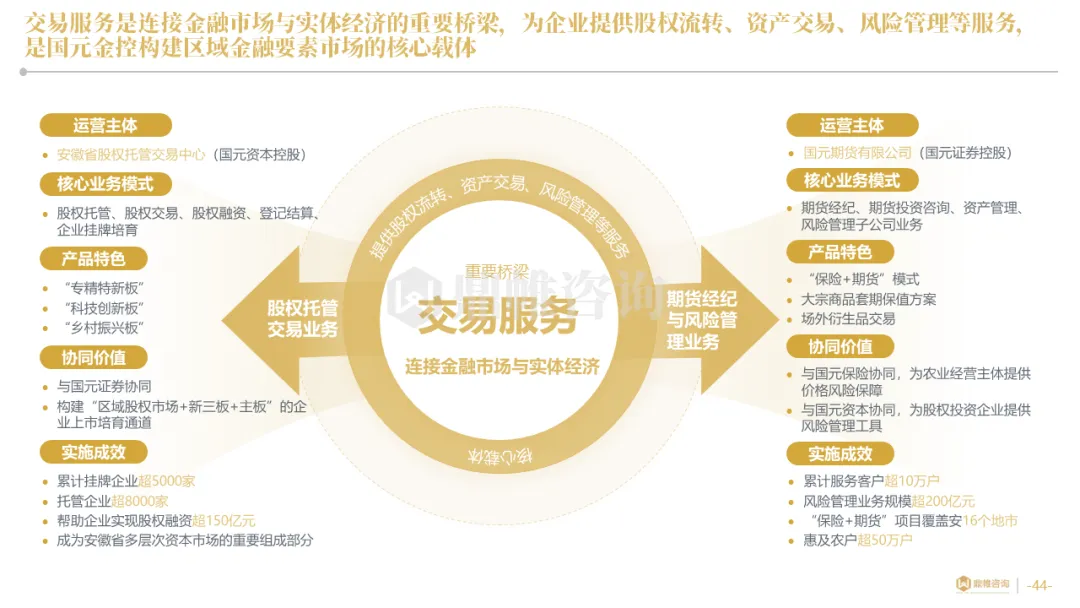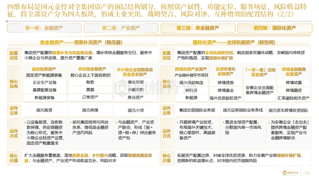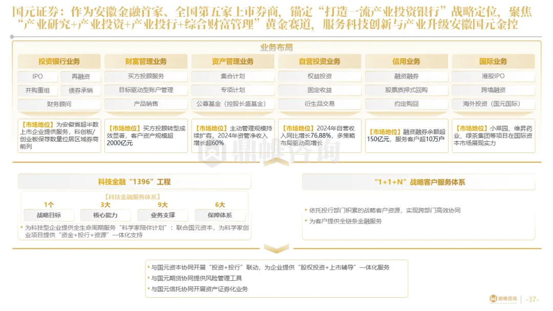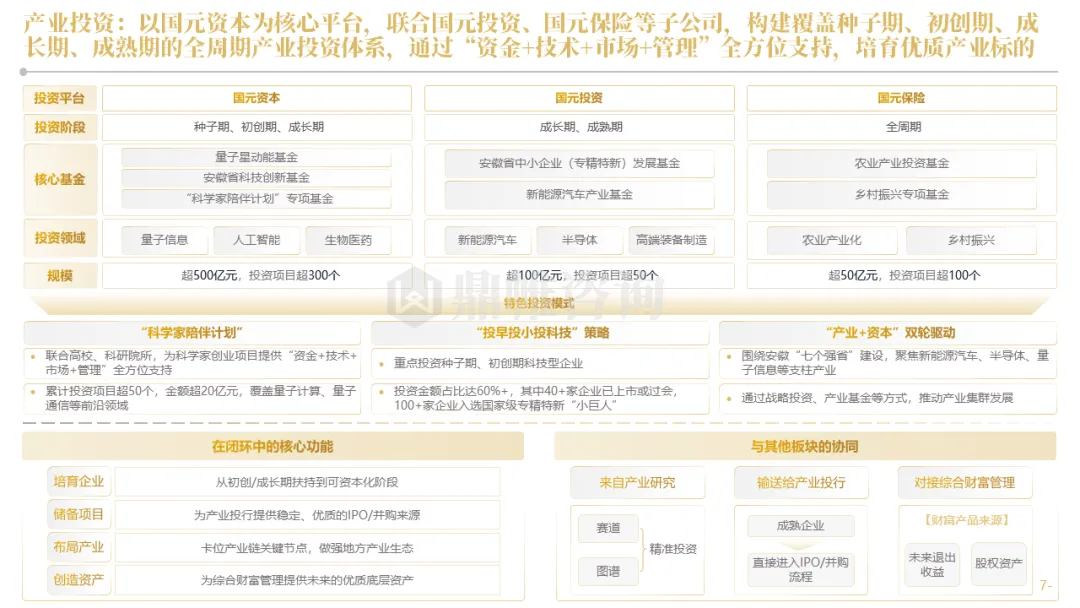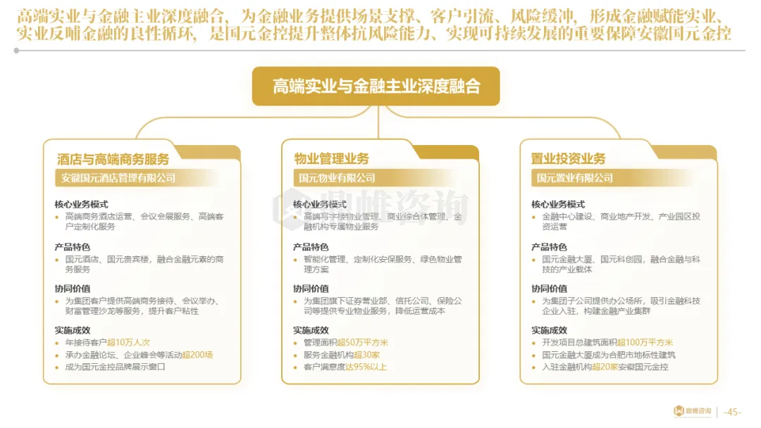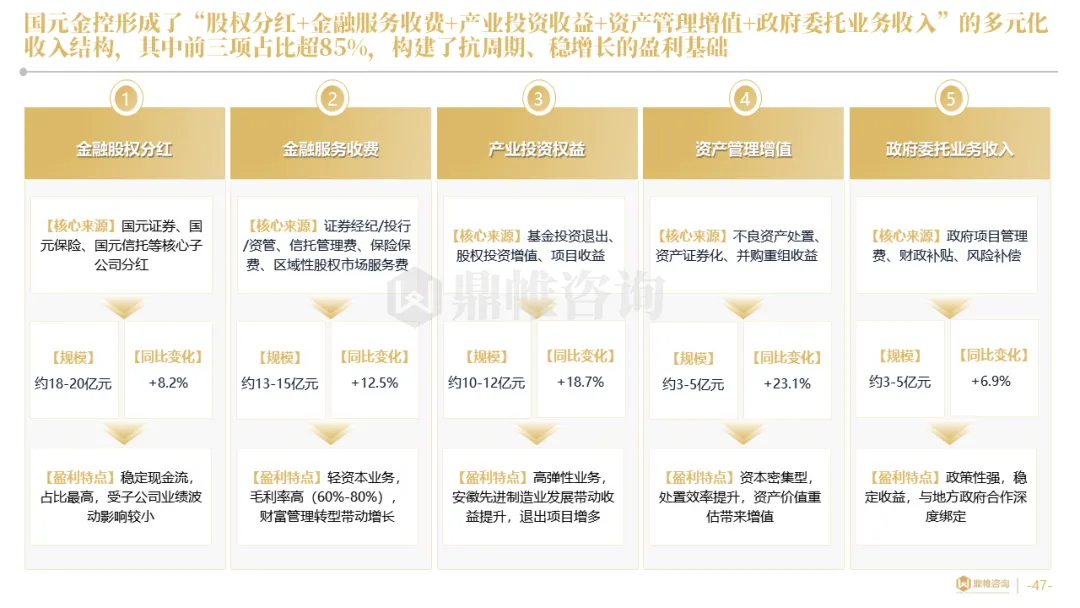 构建“一主两翼+6+N”完整业务体系,以持牌金融业务为核心主体,类金融业务为服务延伸左翼,高端实业为场景支撑右翼;以国元证券、国元保险等六大核心板块为业务支柱,配套多元补充业务,形成全牌照、全链条的综合金融服务生态。