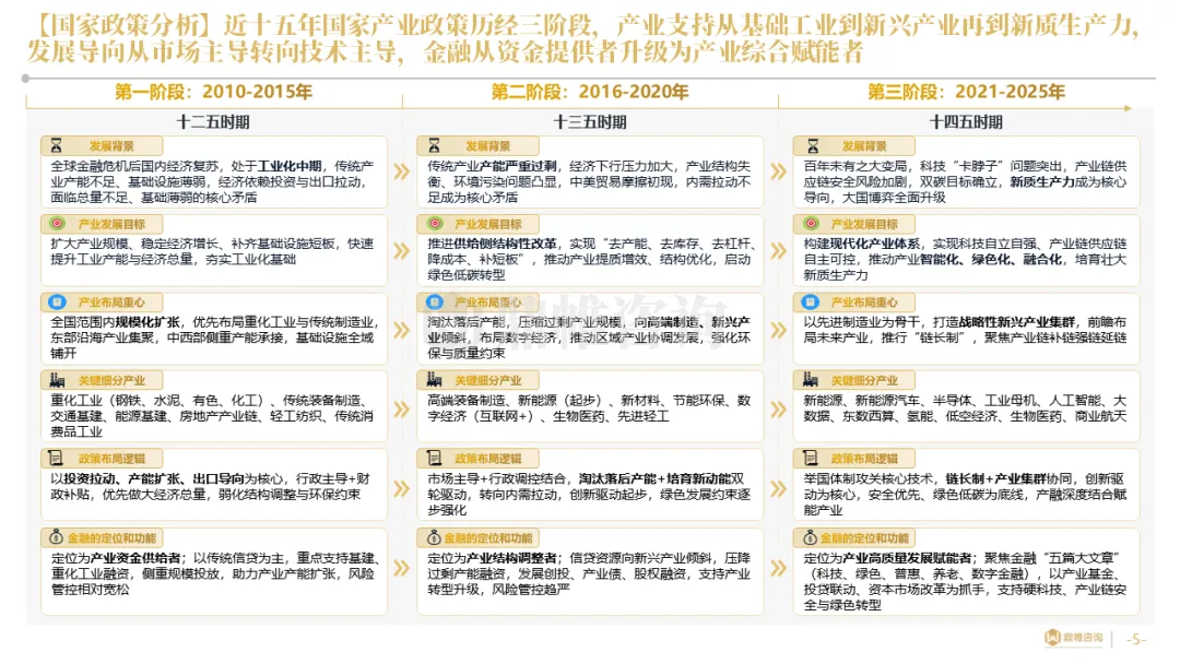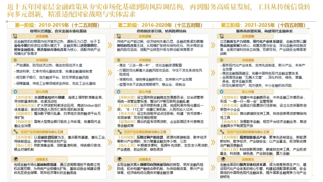 当前,历经三个五年计划迭代,产业发展从传统产能扩张转向供给侧结构优化,最终锚定新质生产力培育;金融定位同步从产业资金供给者,升级为结构调整引导者,最终定位于产业高质量发展赋能者,进入十五五后,金融政策将主要聚焦资本市场改革与金融“五篇大文章”落地,省级金控成为区域战略落地的核心金融载体。