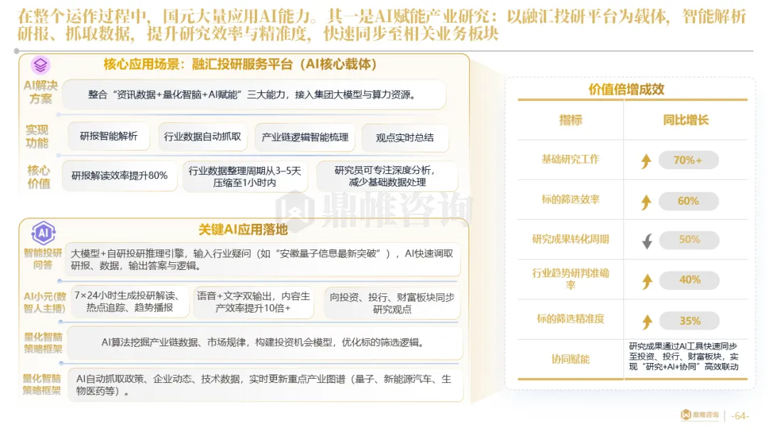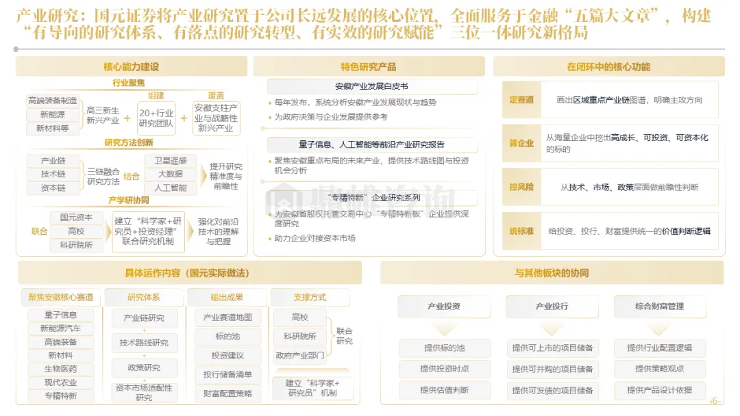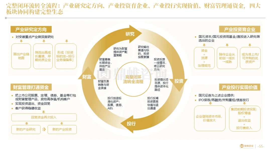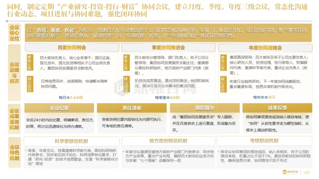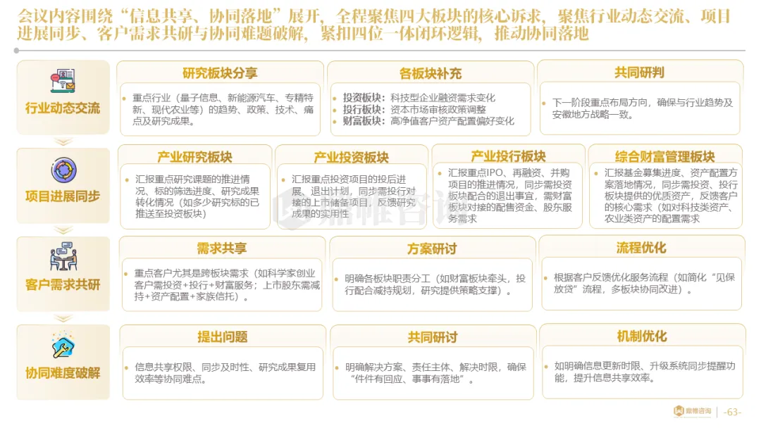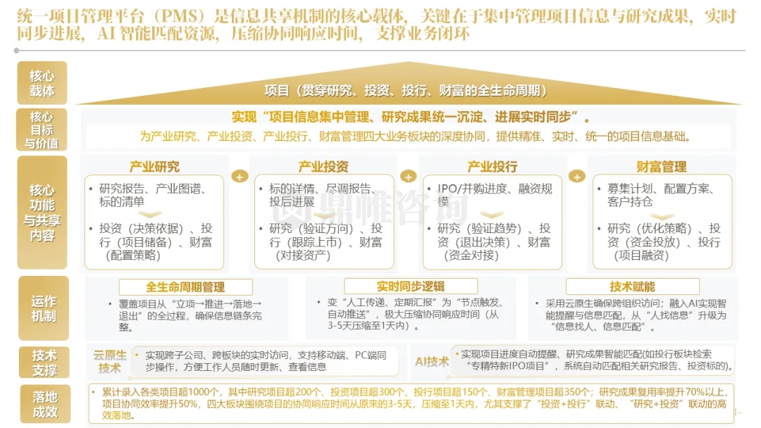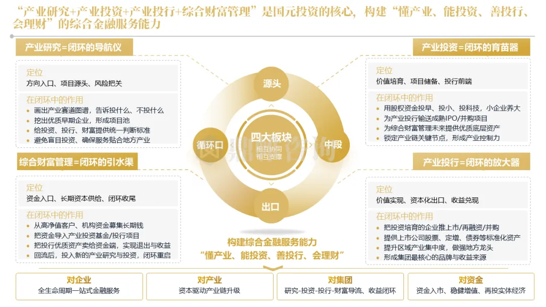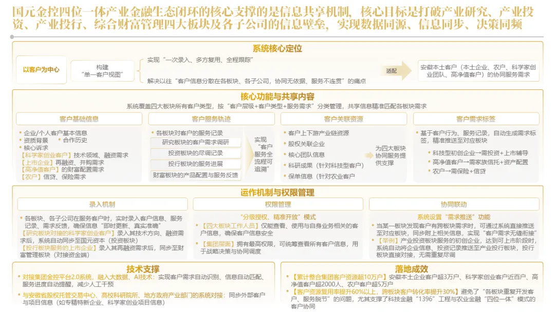 打造“产业研究+产业投资+产业投行+综合财富管理”四位一体产业金融闭环,形成完整的价值创造与资金循环链条,打破传统金控牌照拼凑、业务割裂的行业痛点;AI技术全流程赋能四大核心板块,配套统一信息共享、项目管理与常态化协同机制,保障业务闭环高效落地。