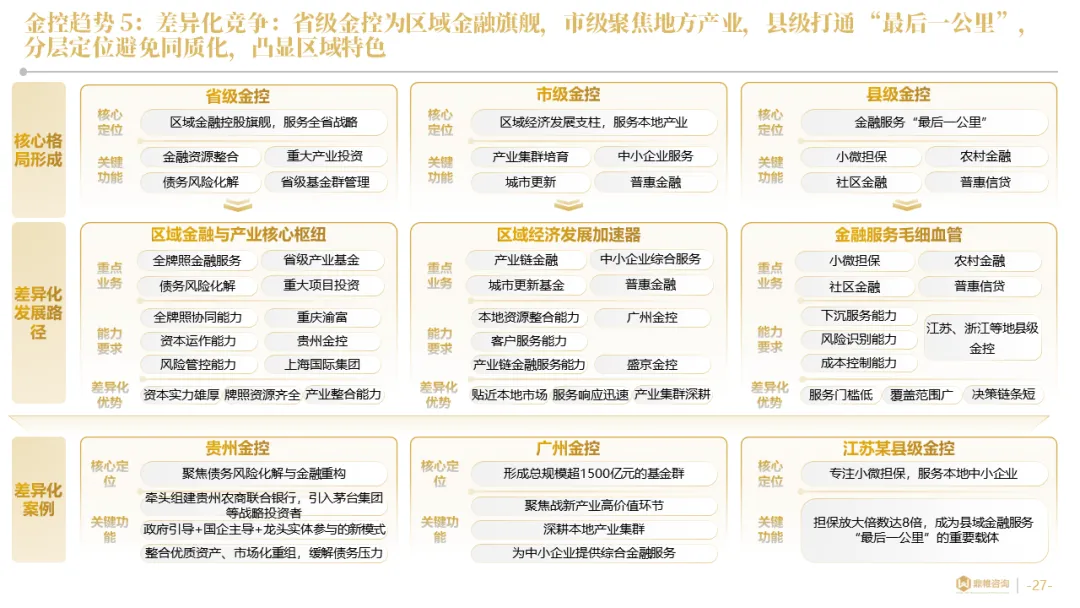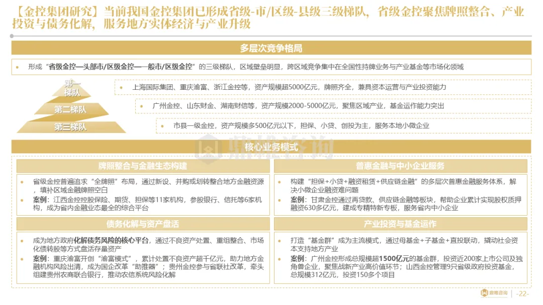 国内金控行业已形成省-市-县三级梯队,区域壁垒特征显著。省级头部机构资产规模超5000亿元,比拼全牌照协同与产融结合能力;市级机构聚焦区域产业深耕;县级机构核心发力普惠金融下沉。行业竞争已从牌照数量比拼,转向综合服务与产融协同能力的较量。