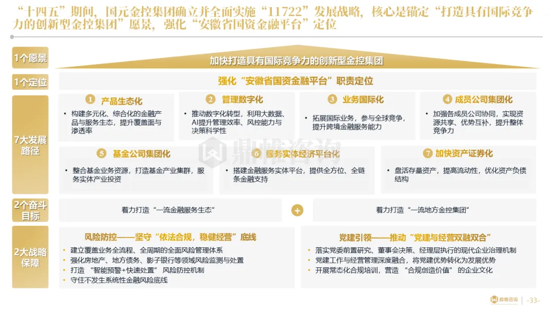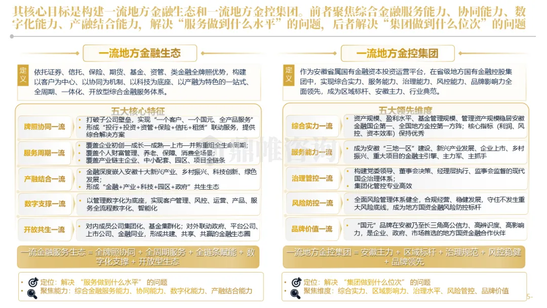 以“11722”发展战略为核心纲领,锚定“安徽省国资金融平台”核心定位,以打造创新型金控集团为愿景,通过七大发展路径,全力实现一流金融服务生态、一流地方金控集团两大目标,战略深度绑定安徽省域发展核心部署。
