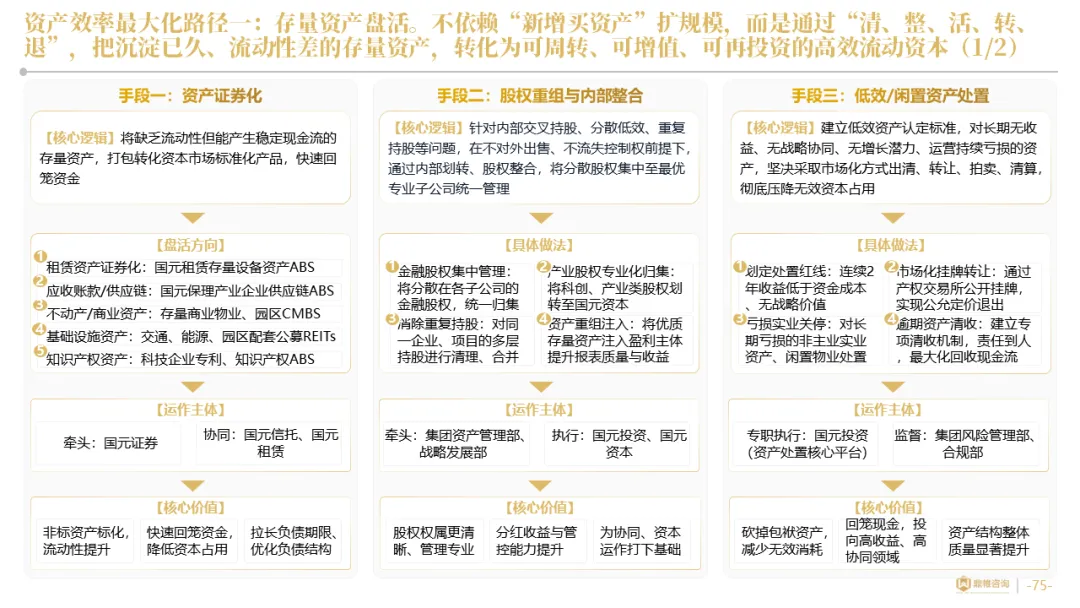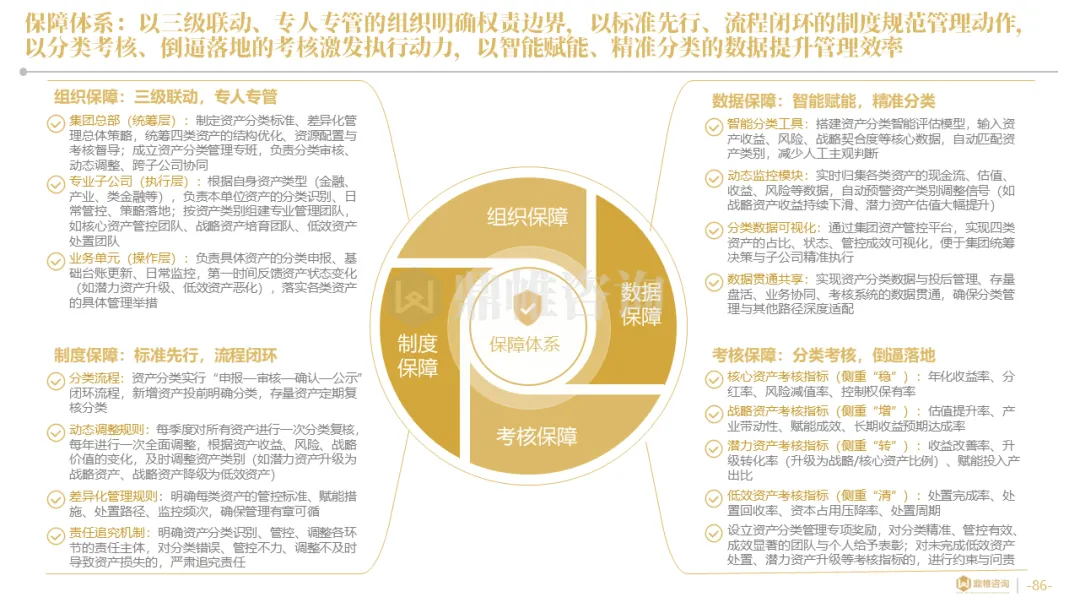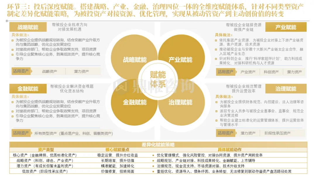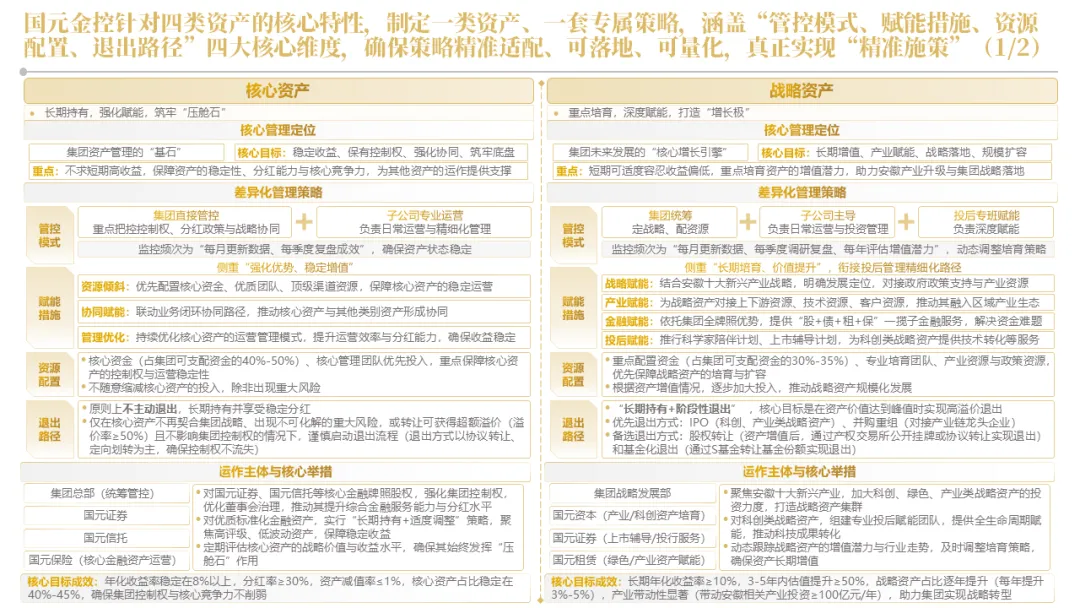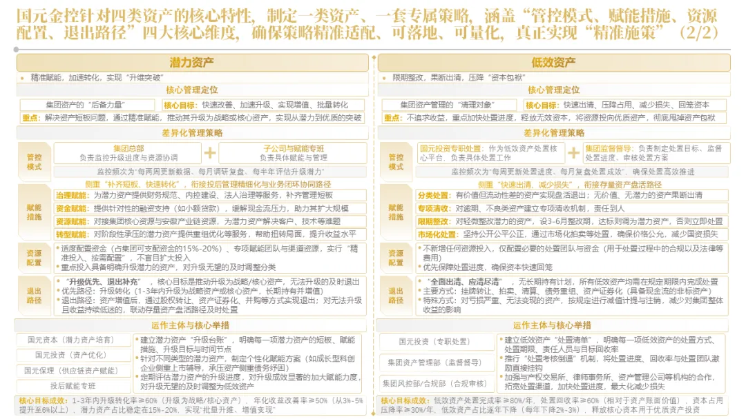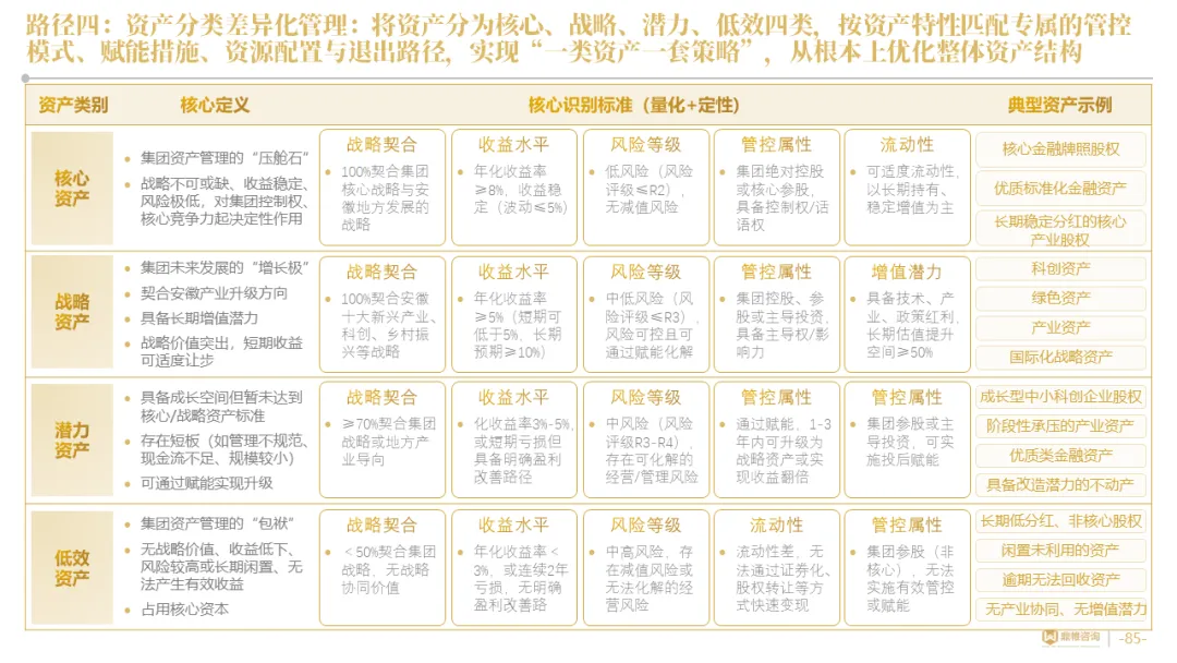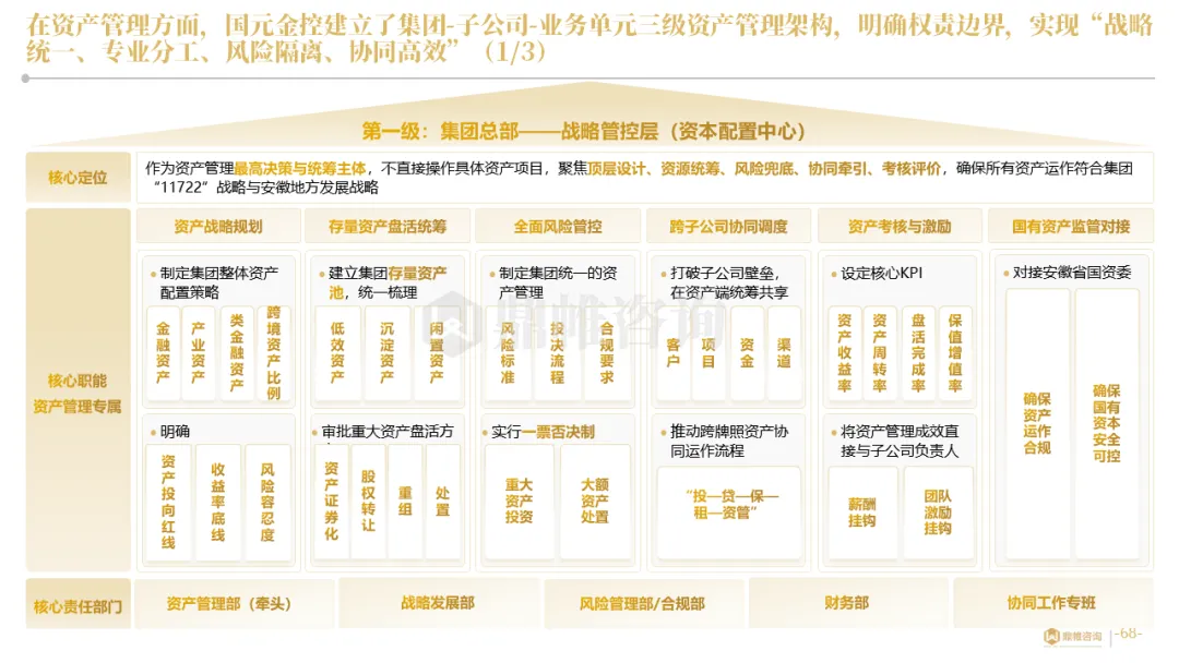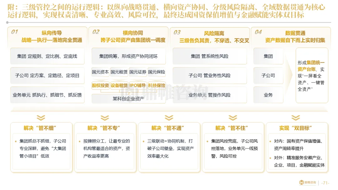 建立集团-子公司-业务单元三级管控架构,搭建四维资产配置结构,通过政策性与市场化双轮驱动,平衡国企战略使命与市场化经营效益;以存量资产盘活、业务闭环协同、精细化投后管理、差异化资产分类四大路径,实现资产效率最大化与国有资产保值增值。