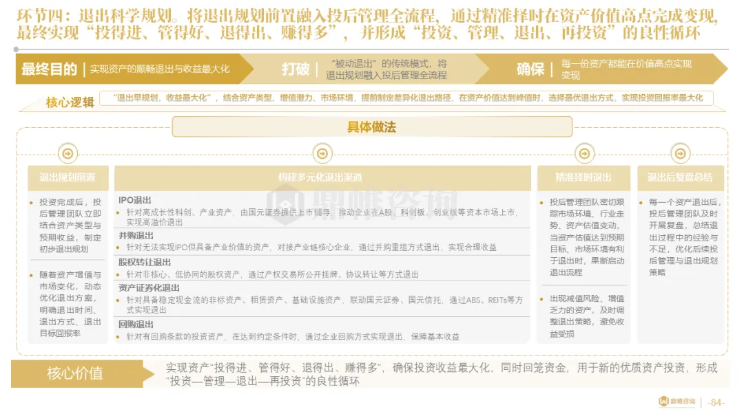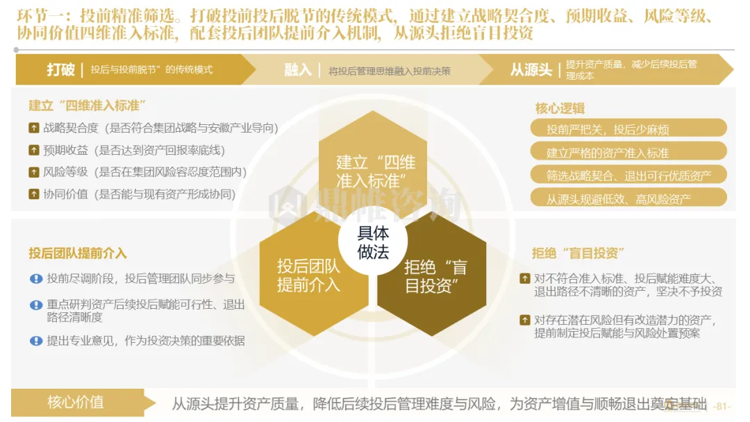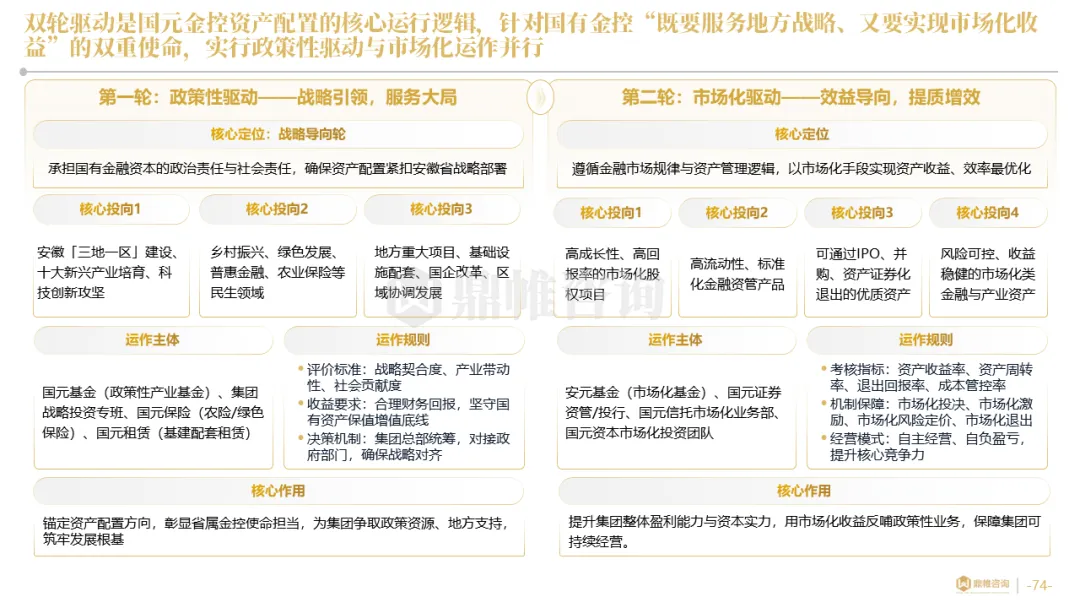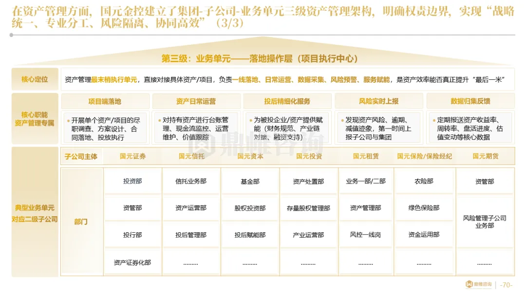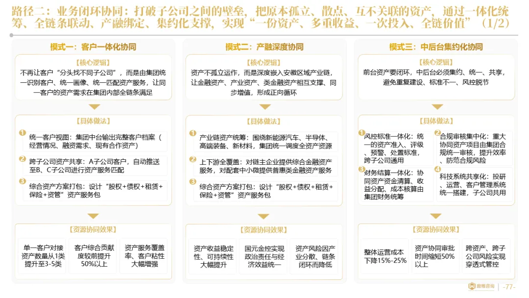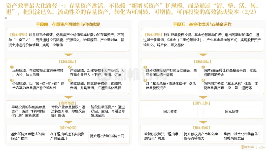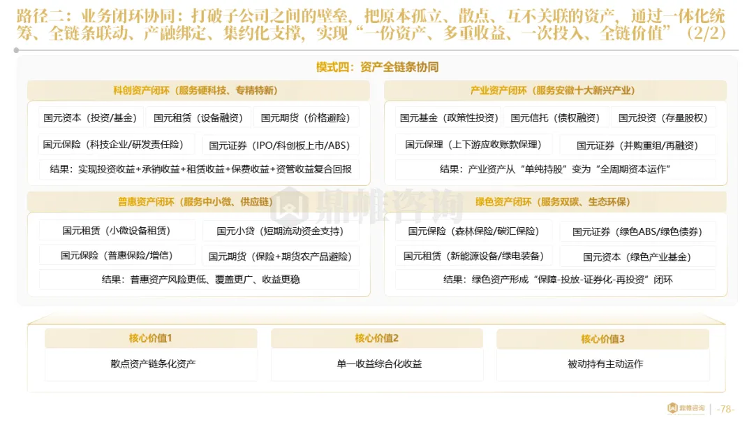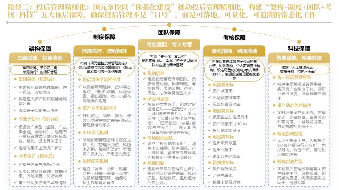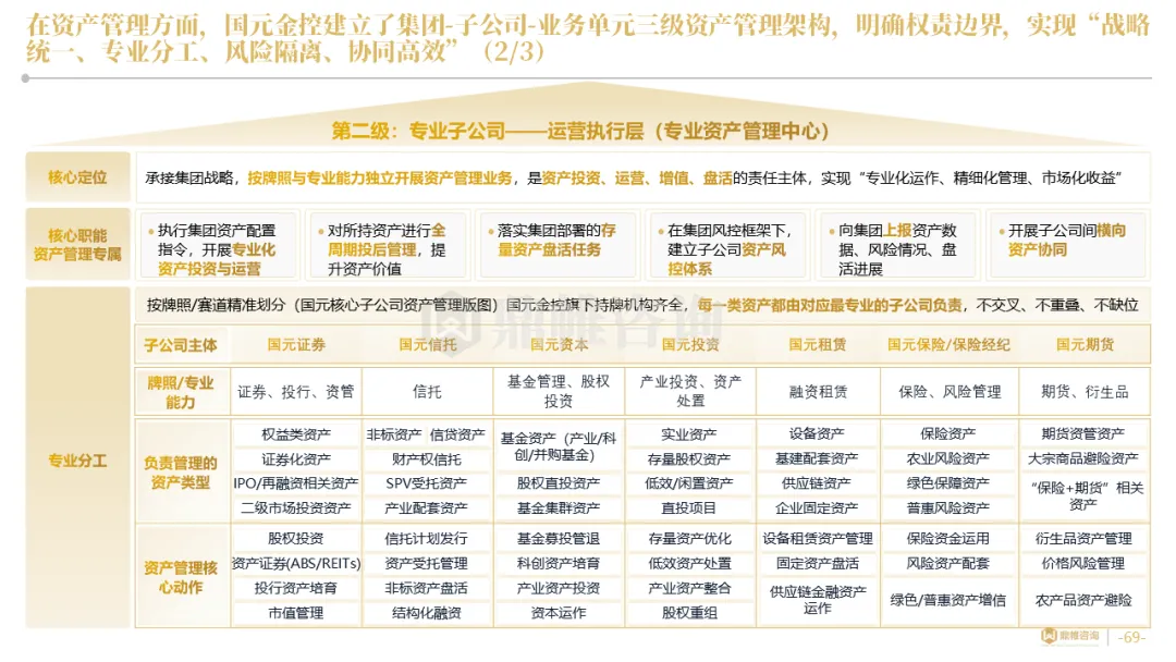 建立集团-子公司-业务单元三级管控架构,搭建四维资产配置结构,通过政策性与市场化双轮驱动,平衡国企战略使命与市场化经营效益;以存量资产盘活、业务闭环协同、精细化投后管理、差异化资产分类四大路径,实现资产效率最大化与国有资产保值增值。