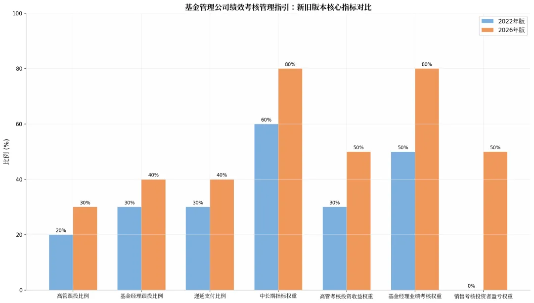 | 基金经理业绩考核权重 | 建议性要求 | ≥80% | 新增刚性要求 |