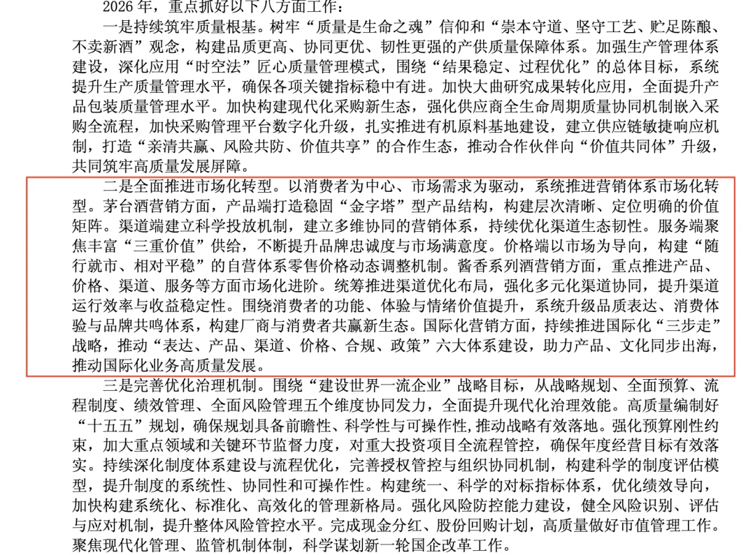 管理层把“全面推进市场化转型”放到第二位,也可以看出茅台的转变,以往财报都是一些什么“ESG生态体系”什么的。可以看出茅台排除市场转型巨大阻力的决心。而第一点依然是“质量至上”,重视质量是永远不会变的,永远写进历年财报经营计划最重要的一点上。旗帜鲜明,必须给茅台点个赞。