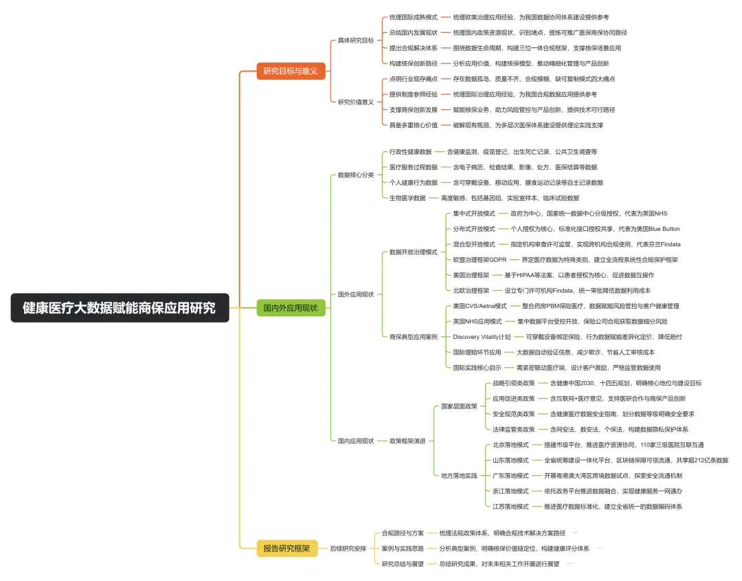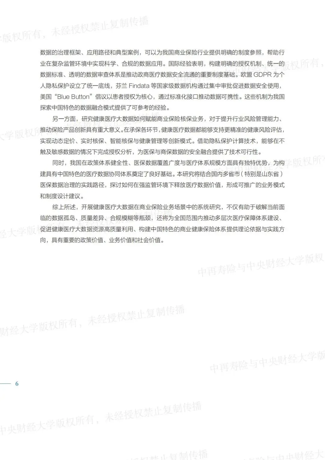 本报告立足健康医疗大数据赋能商业保险的核心场景,以合规、安全、高效、可落地为原则,对比国际三大数据治理模式与监管经验,梳理国内“国家顶层设计 + 地方落地” 政策体系,聚焦山东等标杆实践,构建数据全生命周期合规框架与隐私保护计算技术方案,明确大数据在商保核保全流程的价值链定位,提出健康评分体系、承保前后应用、风险分层经营等实操路径,并从疾病模型、数据融合、技术落地、算法伦理、监管沙盒、数据市场化、人才建设七大方向展望未来。报告兼具理论高度与实践价值,是商业保险数字化、精细化转型的重要参考。