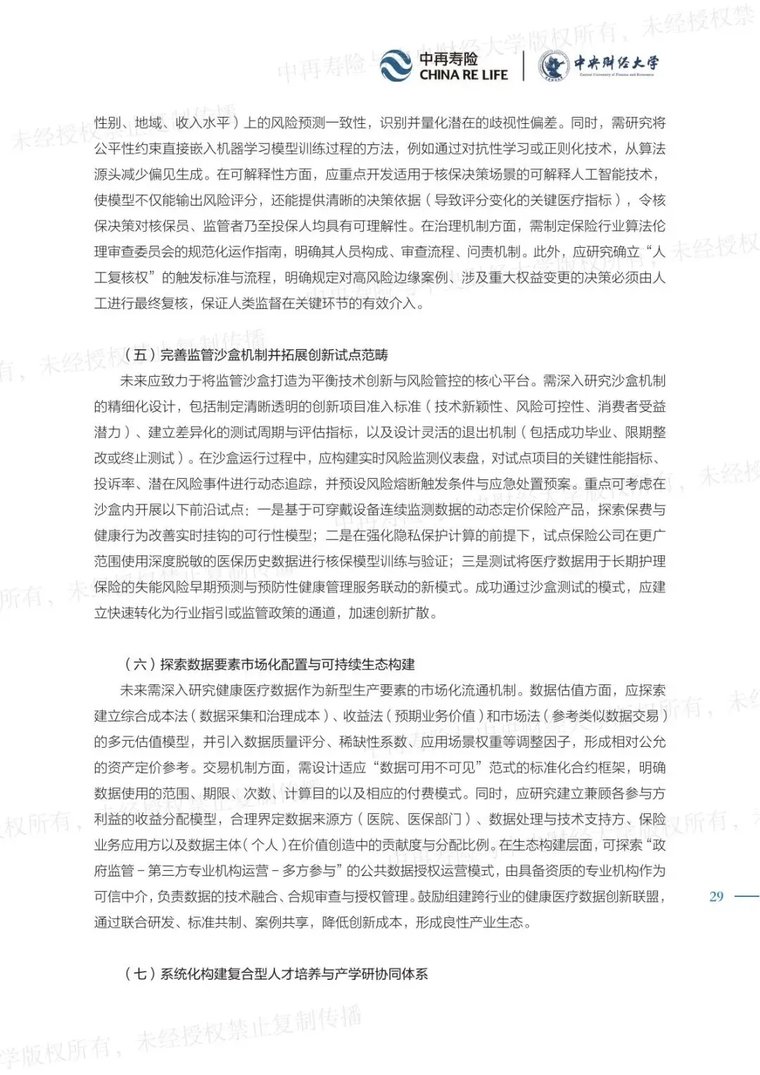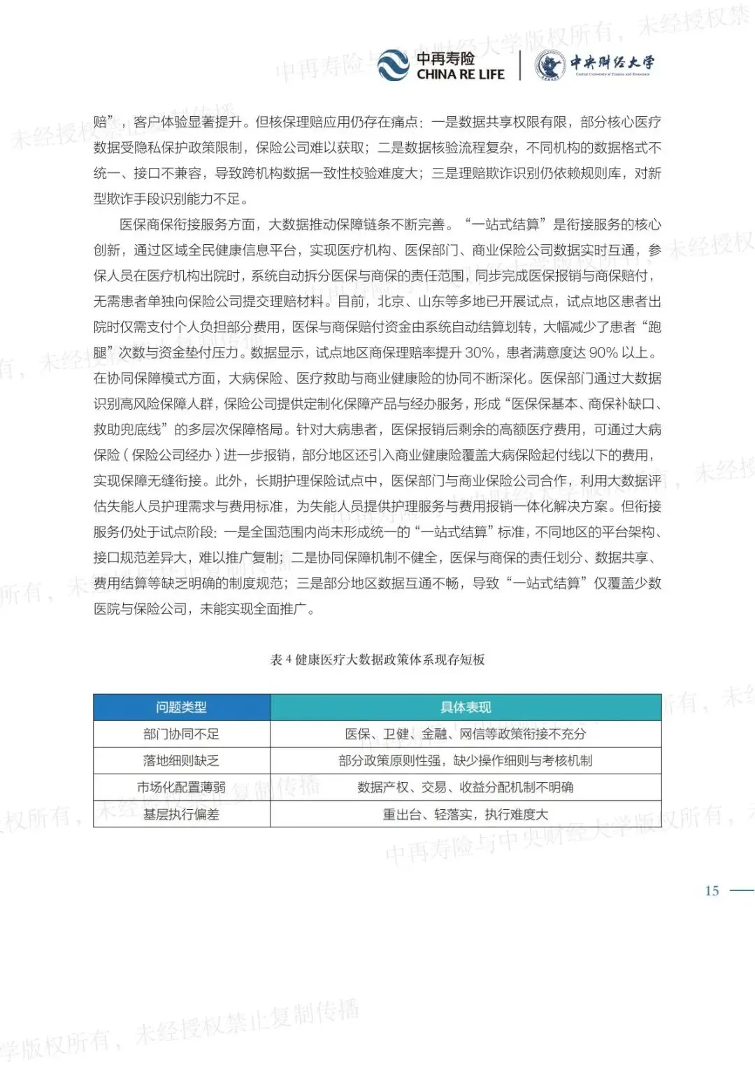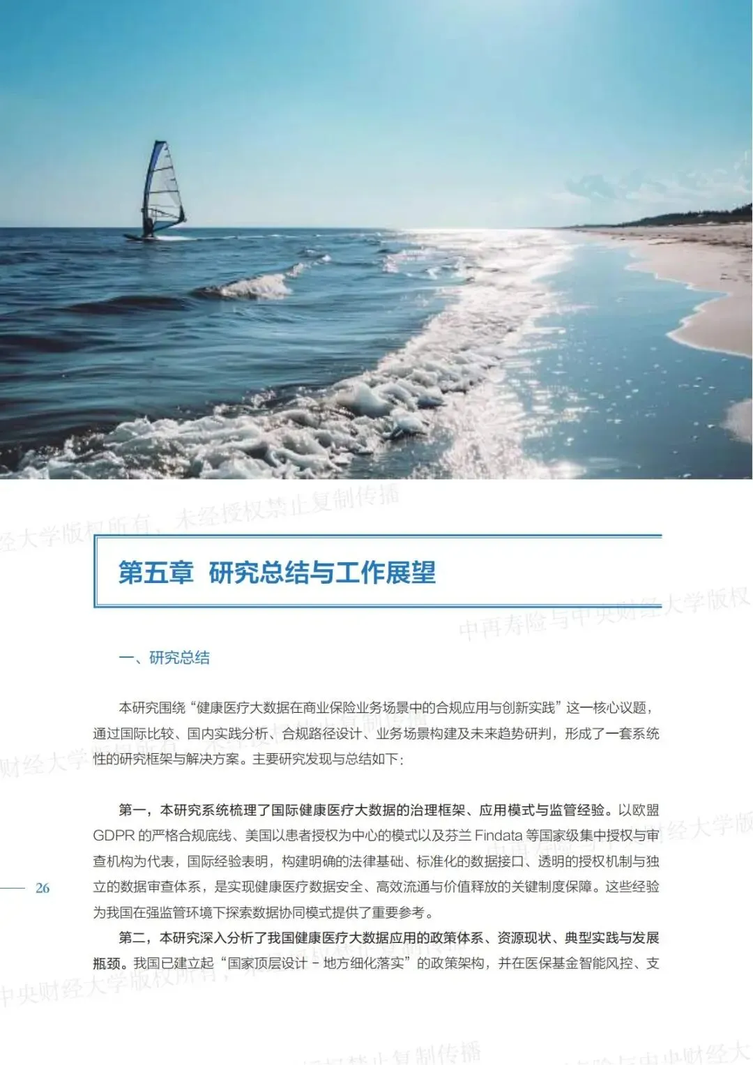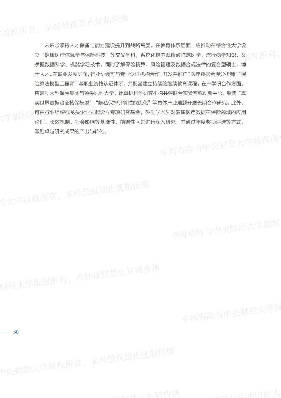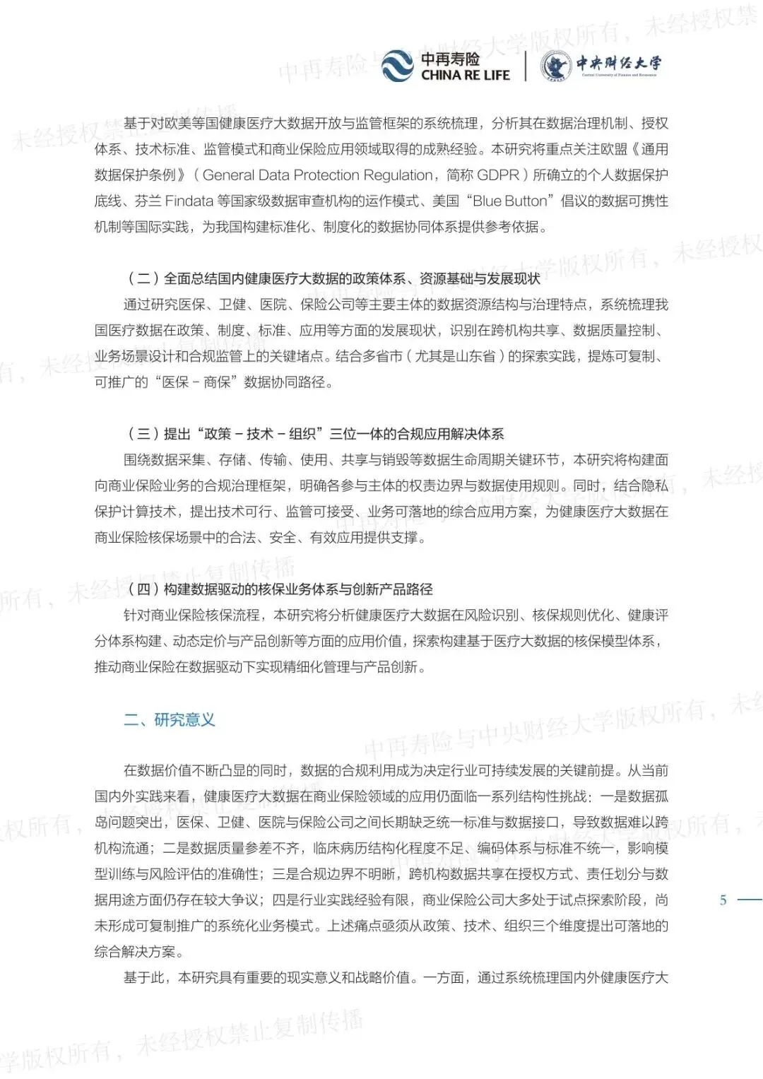 2026年4月,中再寿险联合中央财经大学发布《健康医疗大数据赋能商业保险应用研究报告(精编版)》,系统梳理国内外实践、搭建合规框架、落地核保创新、提炼可复制模式,直面数据孤岛、合规模糊、质量参差等行业痛点,给出“政策 - 技术 - 业务 - 生态” 一体化落地方案,为保险行业在强监管环境下安全高效运用医疗数据提供权威指引。