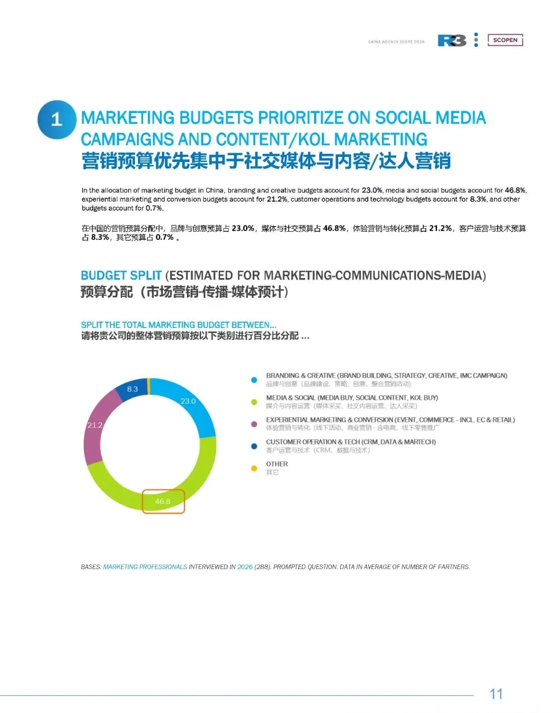 营销预算的流向已经非常清晰。在中国市场,46.8% 的营销预算被分配到了媒介与社交领域,这其中包括媒体采买、社交内容运营和达人采买。品牌与创意预算占比 23.0%,体验营销与转化预算占 21.2%,客户运营与技术预算仅占 8.3%,其他预算占 0.7%。这样的分配结构反映了当前市场的核心诉求,即通过社交媒体和内容营销快速触达消费者并实现转化。