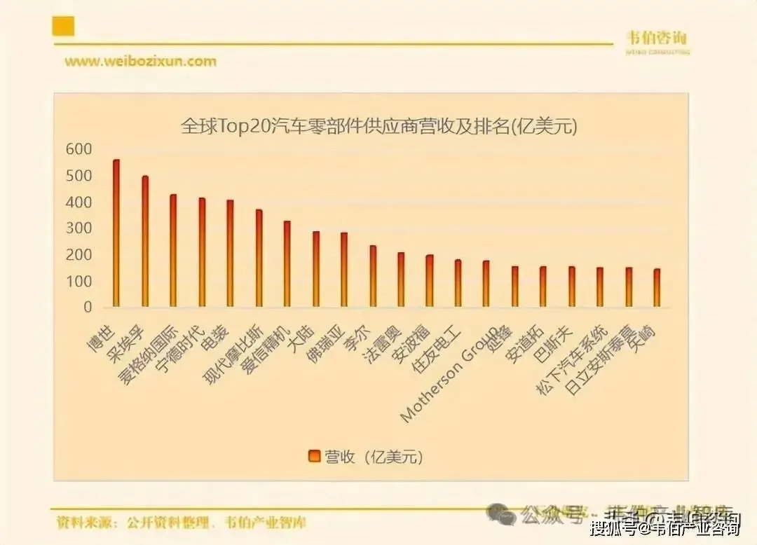 图表2:全球Top20汽车零部件企业营收及排名(亿美元)