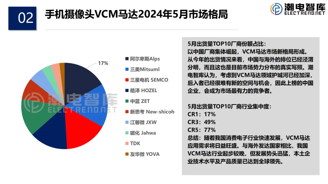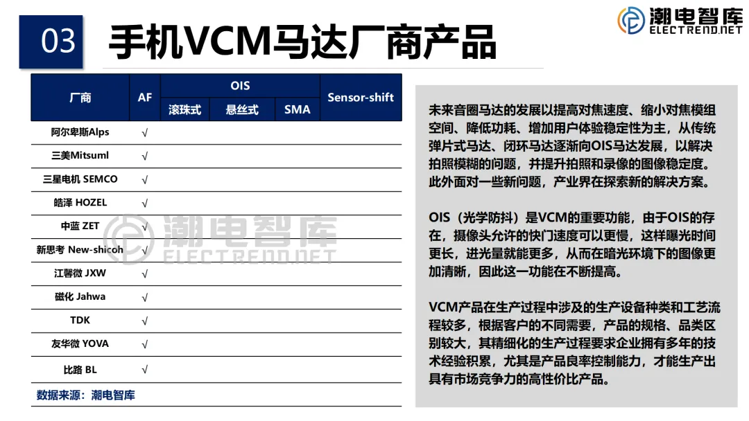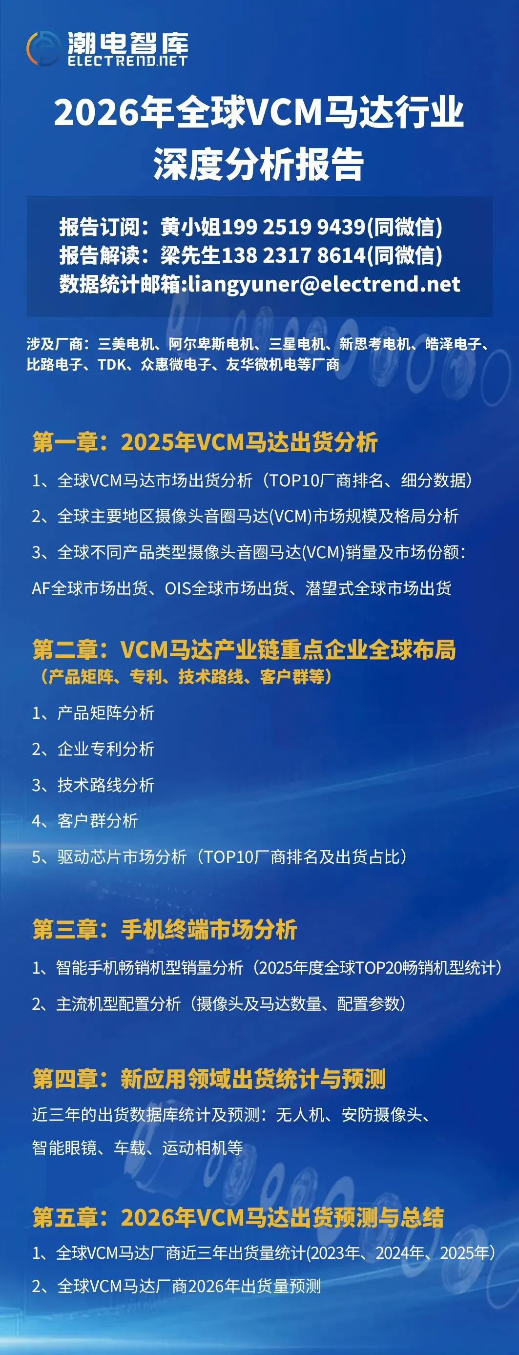 潮电智库研究团队持续跟进VCM马达发展历程,总结现状、深化研究、探索规律,《报告》总计五章,首先介绍了马达行业市场整体出货数据及行业格局、整体运行态势等,接着分析了全球VCM马达重点企业的产品,专利、技术路线、客户群、马达驱动IC市场出货及排名,然后介绍了手机终端畅销机型及摄像头、马达器件的配置。随后,报告对VCM马达新应用领域的近三年出货数据做了分析,最后是行业发展趋势与投资预测。通过详实的数据,全面总结和回顾了2025年VCM马达行业的新趋向、新亮点,同时对现存问题进行了深度思考,为下一步VCM马达行业高质量发展提出了一系列有益的建议和未来的展望。