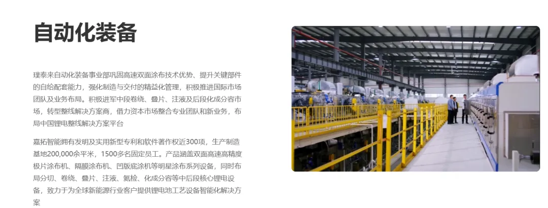 自动化装备与服务:涵盖锂电池生产前中后段关键工序设备,形成整线生产工艺装备的服务能力。