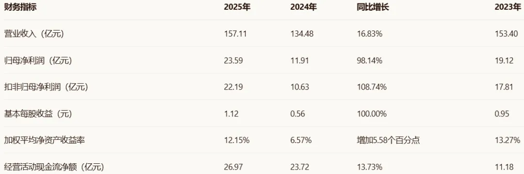 盈利能力大幅修复:2025年归母净利润同比增长98.14%,扭转了2024年净利润下滑37.72%的颓势。