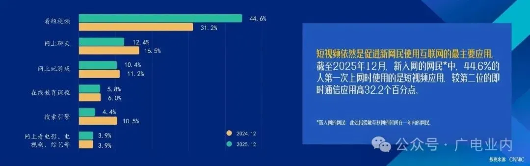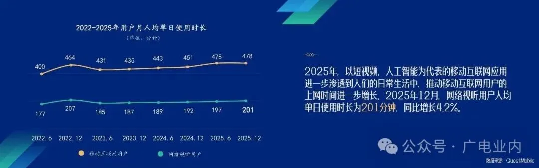 2025年12月,网络视听用户人均单日使用时长达201分钟,同比增长4.2%。其中,微短剧人均单日使用时长达129分钟,已超越长视频,跃居视听细分应用第二位。